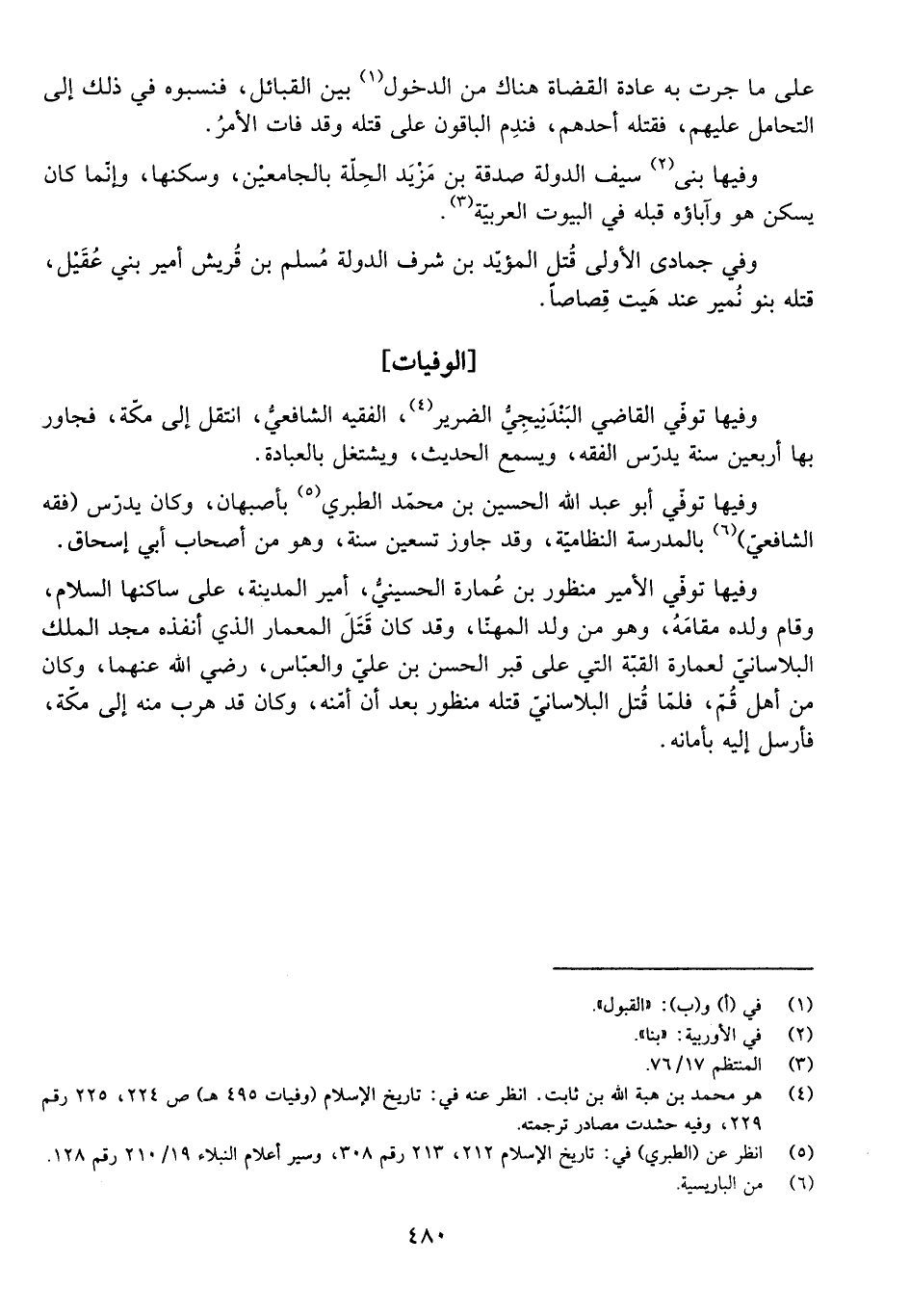[الْوَفَيَاتُ] وَفِيهَا تُوُفِّيَ الْقَاضِي الْبَنْدَنِيجِيُّ الضَّرِيرُ، الْفَقِيهُ الشَّافِعِيُّ، انْتَقَلَ إِلَى مَكَّةَ، فَجَاوَرَ بِهَا أَرْبَعِينَ سَنَةً يُدَرِّسُ الْفِقْهَ، وَيُسْمِعُ الْحَدِيثَ، وَيَشْتَغِلُ بِالْعِبَادَةِ.