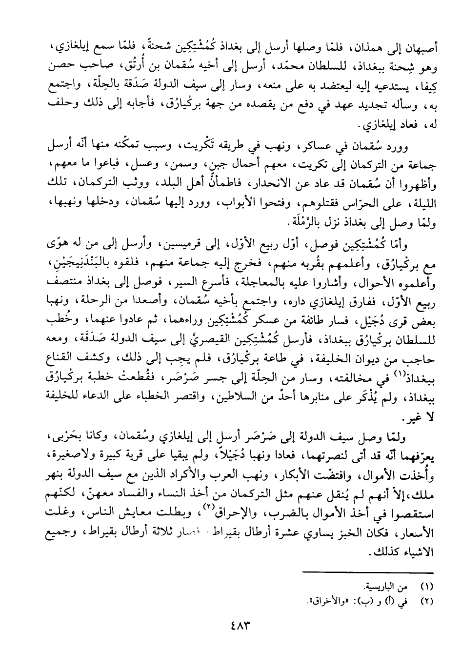 وَأَمَّا كُمُشْتِكِينَ فَوَصَلَ، أَوَّلَ رَبِيعٍ الْأَوَّلِ، إِلَى قَرْمِيسِينَ، وَأَرْسَلَ إِلَى مَنْ لَهُ هَوًى مَعَ بَرْكِيَارُقَ، وَأَعْلَمَهُمْ بِقُرْبِهِ مِنْهُمْ، فَخَرَجَ إِلَيْهِ جَمَاعَةٌ مِنْهُمْ، فَلَقَوْهُ بِالْبَنْدَنِيجَيْنِ، وَأَعْلَمُوهُ الْأَحْوَالَ، وَشَارُوا عَلَيْهِ بِالْمُعَاجَلَةِ، فَأَسْرَعَ السَّيْرَ، فَوَصَلَ إِلَى بَغْدَاذَ مُنْتَصَفَ رَبِيعٍ الْأَوَّلِ، فَفَارَقَ إِيلْغَازِي دَارَهُ، وَاجْتَمَعَ بِأَخِيهِ سُقْمَانَ، وَأَصْعَدَا مِنَ الرَّمْلَةِ، وَنَهَبَا بَعْضَ قُرَى دُجَيْلٍ، فَسَارَ طَائِفَةٌ مِنْ عَسْكَرِ كُمُشْتِكِينَ وَرَاءَهُمَا، ثُمَّ عَادُوا عَنْهُمَا، وَخُطِبَ لِلسُّلْطَانِ بَرْكِيَارُقَ بِبَغْدَاذَ فَأَرْسَلَ كُمُشْتِكِينُ الْقَيْصَرِيُّ إِلَى سَيْفِ الدَّوْلَةِ صَدَقَةَ، وَمَعَهُ حَاجِبٌ مِنْ دِيوَانِ الْخَلِيفَةِ، فِي طَاعَةِ بَرْكِيَارُقَ، فَلَمْ يُجِبْ إِلَى ذَلِكَ، وَكَشَفَ الْقِنَاعَ بِبَغْدَاذَ فِي مُخَالَفَتِهِ، وَسَارَ مِنَ الْحِلَّةِ إِلَى جِسْرِ صَرْصَرٍ، فَقُطِعَتْ خُطْبَةُ بَرْكِيَارُقَ بِبَغْدَاذَ، وَلَمْ يُذْكَرْ عَلَى مَنَابِرِهَا أَحَدٌ مِنَ السَّلَاطِينِ، وَاقْتَصَرَ الْخُطَبَاءُ عَلَى الدُّعَاءِ لِلْخَلِيفَةِ لَا غَيْرَ.