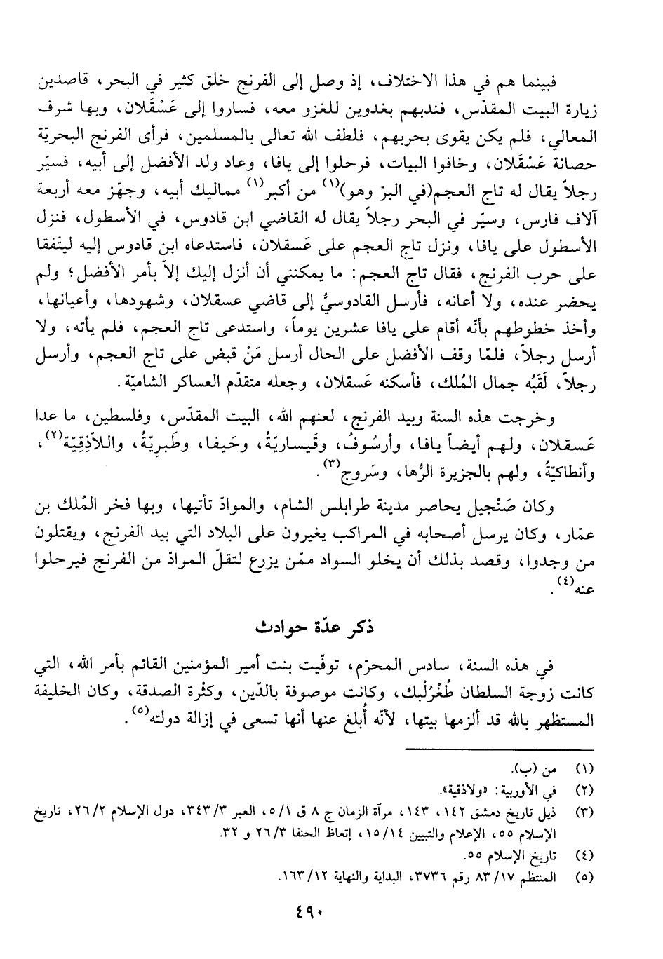 وَخَرَجَتْ هَذِهِ السَّنَةُ وَبِيَدِ الْفِرِنْجِ، لَعَنَهُمُ اللَّهُ، الْبَيْتُ الْمُقَدَّسُ، وَفِلَسْطِينُ، مَا عَدَا عَسْقَلَانَ، وَلَهُمْ أَيْضًا يَافَا، وَأَرْسُوفُ، وقَيْسَارِيَّةُ، وَحَيْفَا، وَطَبَرِيَّةُ، وَاللَّاذِقِيَّةُ، وَأَنْطَاكِيَةُ، وَلَهُمْ بِالْجَزِيرَةِ الرُّهَا، وَسَرُوجٌ.