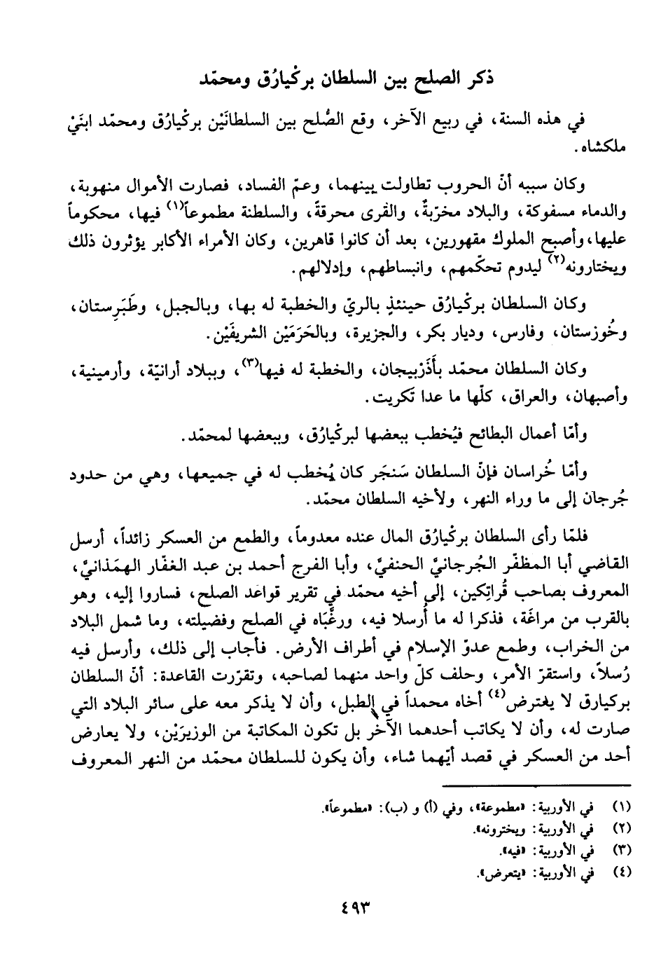 فَلَمَّا رَأَى السُّلْطَانُ بَرْكِيَارُقُ الْمَالَ عِنْدَهُ مَعْدُومًا، وَالطَّمَعَ مِنَ الْعَسْكَرِ زَائِدًا، أَرْسَلَ الْقَاضِيَ أَبَا الْمُظَفَّرِ الْجُرْجَانِيَّ الْحَنَفِيَّ، وَأَبَا الْفَرَجِ أَحْمَدَ بْنَ عَبْدِ الْغَفَّارِ الْهَمَذَانِيَّ، الْمَعْرُوفَ بِصَاحِبِ قُرَاتِكِينَ، إِلَى أَخِيهِ مُحَمَّدٍ فِي تَقْرِيرِ قَوَاعِدِ الصُّلْحِ، فَسَارَ إِلَيْهِ، وَهُوَ بِالْقُرْبِ مِنْ مَرَاغَةَ، فَذَكَرَا لَهُ مَا أُرْسِلَا فِيهِ، وَرَغَّبَاهُ فِي الصُّلْحِ وَفَضِيلَتِهِ، وَمَا شَمِلَ الْبِلَادَ مِنَ الْخَرَابِ، وَطَمَعِ عَدُوِّ الْإِسْلَامِ فِي أَطْرَافِ الْأَرْضِ، فَأَجَابَ إِلَى ذَلِكَ، وَأَرْسَلَ فِيهِ رُسُلًا، وَاسْتَقَرَّ الْأَمْرُ، وَحَلَفَ كُلُّ وَاحِدٍ مِنْهُمَا لِصَاحِبِهِ، وَتَقَرَّرَتِ الْقَاعِدَةُ: أَنَّ السُّلْطَانَ بَرْكِيَارُقَ لَا يَعْتَرِضُ أَخَاهُ مُحَمَّدًا فِي الطَّبْلِ، وَأَنْ لَا يُذْكَرَ مَعَهُ عَلَى سَائِرِ الْبِلَادِ الَّتِي صَارَتْ لَهُ، وَأَنْ لَا يُكَاتِبَ أَحَدُهُمَا الْآخَرَ بَلْ تَكُونُ الْمُكَاتَبَةُ مِنَ الْوَزِيرَيْنِ، وَلَا يُعَارَضُ أَحَدٌ مِنَ الْعَسْكَرِ فِي قَصْدِ أَيِّهِمَا شَاءَ، وَأَنْ يَكُونَ لِلسُّلْطَانِ مُحَمَّدٍ مِنَ النَّهْرِ الْمَعْرُوفِ