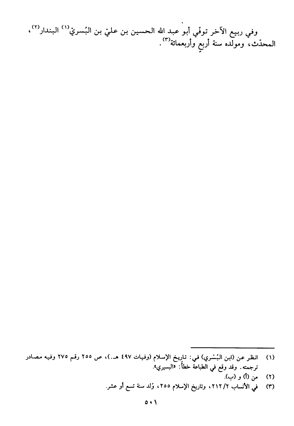 وَفِي رَبِيعٍ الْآخِرِ تُوُفِّيَ أَبُو عَبْدِ اللَّهِ الْحُسَيْنُ بْنُ عَلِيِّ بْنِ الْبُسْرِيِّ الْبُنْدَارُ، الْمُحَدِّثُ، وَمَوْلِدُهُ سَنَةَ أَرْبَعٍ وَأَرْبَعِمِائَةٍ.