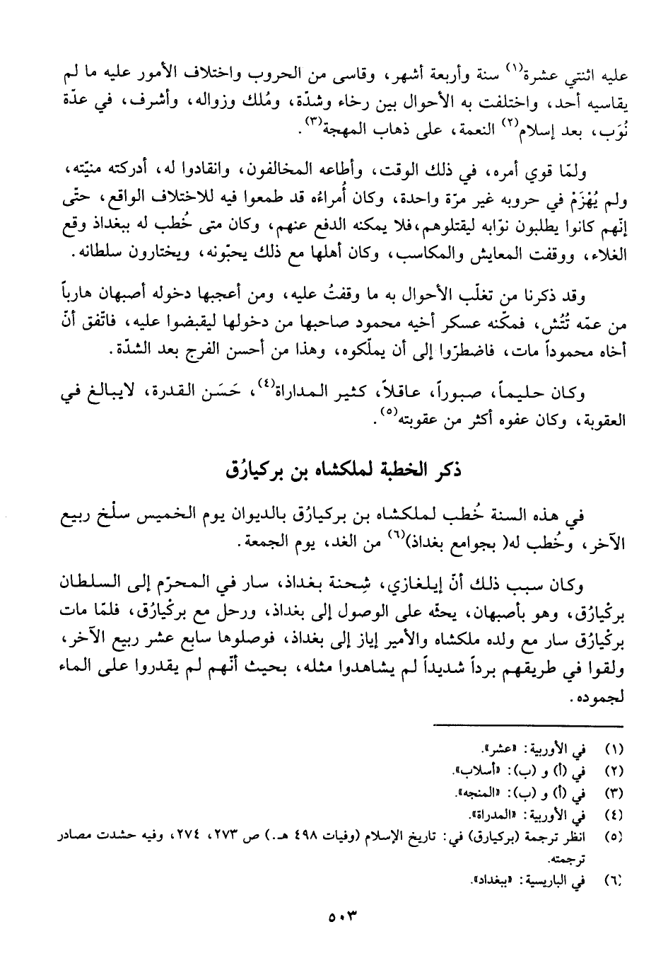 فِي هَذِهِ السَّنَةِ خُطِبَ لِمَلِكْشَاهْ بْنِ بَرْكِيَارُقَ بِالدِّيوَانِ يَوْمَ الْخَمِيسِ سَلْخَ رَبِيعٍ الْآخِرِ، وَخُطِبَ لَهُ بِجَوَامِعِ بَغْدَاذَ مِنَ الْغَدِ، يَوْمَ الْجُمُعَةِ.