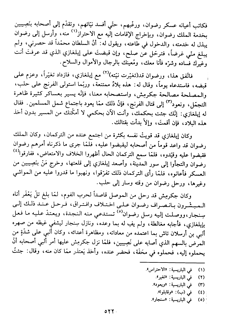 وَكَانَ إِيلْغَازِي قَدْ قَوِيَتْ نَفْسُهُ بِكَثْرَةِ مَنِ اجْتَمَعَ عِنْدَهُ مِنَ التُّرْكُمَانِ، وَكَانَ الْمَلِكُ رِضْوَانُ قَدْ وَاعَدَ قَوْمًا مِنْ أَصْحَابِهِ لِيَقْبِضُوا عَلَيْهِ، فَلَمَّا جَرَى مَا ذَكَرْنَاهُ أَمَرَهُمْ رِضْوَانُ فَقَبَضُوا عَلَيْهِ وَقَيَّدُوهُ، فَلَمَّا سَمِعَ التُّرْكُمَانُ الْحَالَ أَظْهَرُوا الْخِلَافَ وَالِامْتِعَاضَ، فَفَارَقُوا رِضْوَانَ وَالْتَجَأُوا إِلَى سُورِ الْمَدِينَةِ، وَأَصْعَدَ إِيلْغَازِي إِلَى قَلْعَتِهَا، وَخَرَجَ مَنْ بِنَصِيبِينَ مِنَ الْعَسْكَرِ فَأَعَانُوهُ، فَلَمَّا رَأَى التُّرْكُمَانُ ذَلِكَ تَفَرَّقُوا، وَنَهَبُوا مَا قَدَرُوا مِنَ الْمَوَاشِي وَغَيْرِهَا، وَرَحَلَ رِضْوَانُ مِنْ وَقْتِهِ وَسَارَ إِلَى حَلَبَ.