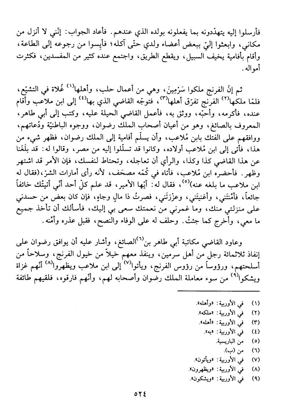 وَعَاوَدَ الْقَاضِيَ مُكَاتَبَةَ أَبِي طَاهِرِ بْنِ الصَّائِغِ، وَأَشَارَ عَلَيْهِ أَنْ يُوَافِقَ رِضْوَانَ عَلَى إِنْفَاذِ ثَلَاثِمِائَةٍ مِنْ أَهْلِ سَرْمِينَ، وَيُنْفِذُ مَعَهُمْ خَيْلًا مِنْ خُيُولِ الْفِرِنْجِ، وَسِلَاحًا مِنْ أَسْلِحَتِهِمْ، وَرُءُوسًا مِنْ رُءُوسِ الْفِرِنْجِ، يَأْتُوا إِلَى ابْنِ مُلَاعِبٍ وَيُظْهِرُوا أَنَّهُمْ غُزَاةً وَيَشْكُوا مِنْ سُوءِ مُعَامَلَةِ الْمَلِكِ رِضْوَانَ وَأَصْحَابِهِ لَهُمْ، وَأَنَّهُمْ فَارَقُوهُ، فَلَقِيَهُمْ طَائِفَةٌ