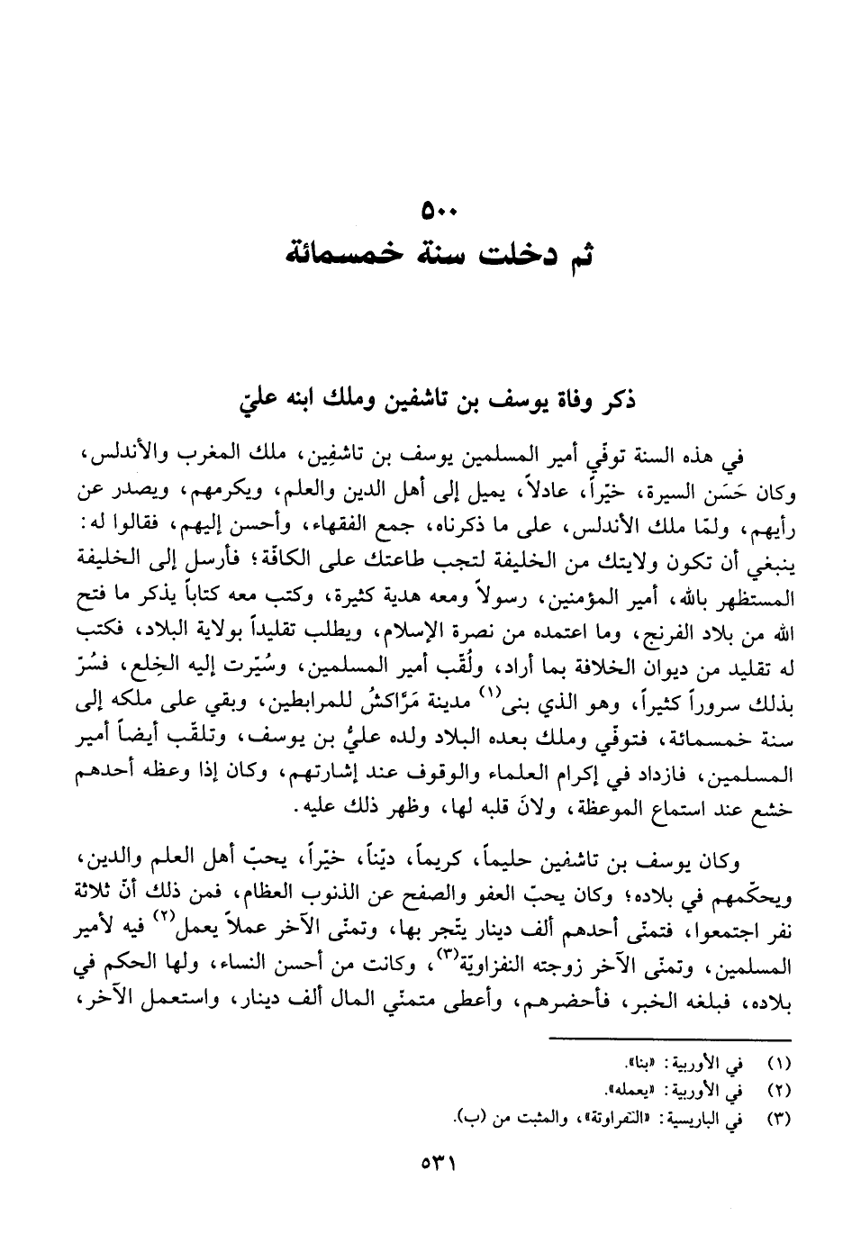فِي هَذِهِ السَّنَةِ تُوُفِّيَ أَمِيرُ الْمُسْلِمِينَ يُوسُفُ بْنُ تَاشَفِينَ، مَلِكُ الْغَرْبِ وَالْأَنْدَلُسِ، وَكَانَ حَسَنَ السِّيرَةِ، خَيِّرًا، عَادِلًا، يَمِيلُ إِلَى أَهْلِ الدِّينِ وَالْعِلْمِ، وَيُكْرِمُهُمْ، وَيَصْدُرُ عَنْ رَأْيِهِمْ، وَلَمَّا مَلَكَ الْأَنْدَلُسَ، عَلَى مَا ذَكَرْنَاهُ، جَمَعَ الْفُقَهَاءَ وَأَحْسَنَ إِلَيْهِمْ، فَقَالُوا لَهُ: يَنْبَغِي أَنْ تَكُونَ وِلَايَتُكَ مِنَ الْخَلِيفَةِ لِتَجِبَ طَاعَتُكَ عَلَى الْكُوفَةِ، فَأَرْسَلَ إِلَى الْخَلِيفَةِ الْمُسْتَظْهِرِ بِاللَّهِ، أَمِيرِ الْمُؤْمِنِينَ، رَسُولًا وَمَعَهُ هَدِيَّةٌ كَثِيرَةٌ، وَكَتَبَ مَعَهُ كِتَابًا يَذْكُرُ مَا فَتَحَ اللَّهُ مِنْ بِلَادِ الْفِرِنْجِ، وَمَا اعْتَمَدَهُ مِنْ نُصْرَةِ الْإِسْلَامِ، وَيَطْلُبُ تَقْلِيدًا بِوِلَايَةِ الْبِلَادِ، فَكُتِبَ لَهُ تَقْلِيدٌ مِنْ دِيوَانِ الْخَلِيفَةِ بِمَا أَرَادَ، وَلُقِّبَ أَمِيرَ الْمُسْلِمِينَ، وَسُيِّرَتْ إِلَيْهِ الْخِلَعُ، فَسُرَّ بِذَلِكَ سُرُورًا كَثِيرًا، وَهُوَ الَّذِي بَنَى مَدِينَةَ مُرَّاكِشَ لِلْمُرَابِطِينَ، وَبَقِيَ عَلَى مُلْكِهِ إِلَى سَنَةِ خَمْسِمِائَةٍ، فَتُوُفِّيَ وَمَلَكَ بَعْدَهُ الْبِلَادَ وَلَدُهُ عَلِيُّ بْنُ يُوسُفَ، وَتَلَقَّبَ أَيْضًا أَمِيرَ الْمُسْلِمِينَ، فَازْدَادَ فِي إِكْرَامِ الْعُلَمَاءِ وَالْوُقُوفِ عِنْدَ إِشَارَتِهِمْ، وَكَانَ إِذَا وَعَظَهُ أَحَدُهُمْ خَشَعَ عِنْدَ اسْتِمَاعِ الْمَوْعِظَةِ، وَلَانَ قَلْبُهُ لَهَا، وَظَهَرَ ذَلِكَ عَلَيْهِ.