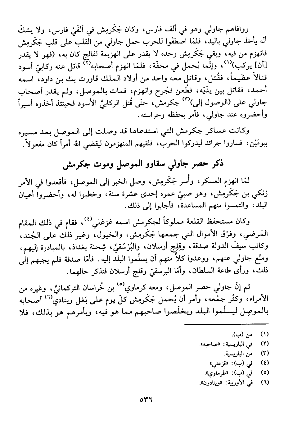 ثُمَّ إِنَّ جَاوْلِي حَصَرَ الْمَوْصِلَ، وَمَعَهُ كَرْمَاوِيُّ بْنُ خُرَاسَانَ التُّرْكُمَانِيُّ، وَغَيْرُهُ مِنَ الْأُمَرَاءِ، وَكَثُرَ جَمْعُهُ، وَأَمَرَ أَنْ يُحْمَلَ جَكَرْمِشُ كُلَّ يَوْمٍ عَلَى بَغْلٍ وَيُنَادِي أَصْحَابَهُ بِالْمَوْصِلِ لِيُسَلِّمُوا الْبَلَدَ وَيُخَلِّصُوا صَاحِبَهُمْ مِمَّا هُوَ فِيهِ، وَيَأْمُرُهُمْ هُوَ بِذَلِكَ، فَلَا