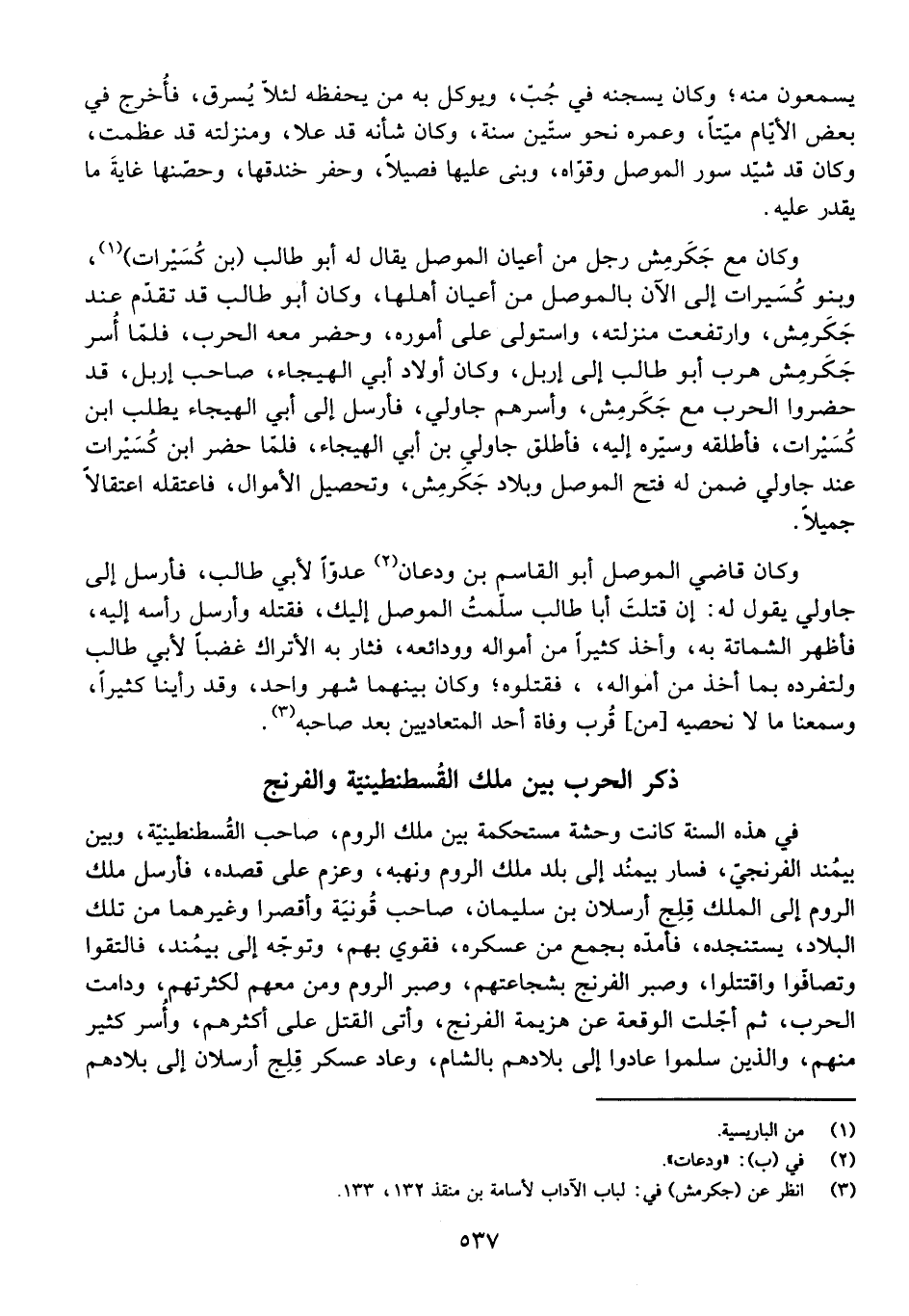 وَكَانَ مَعَ جَكَرْمِشَ رَجُلٌ مِنْ أَعْيَانِ الْمَوْصِلِ يُقَالُ لَهُ أَبُو طَالِبِ بْنُ كُسَيْرَاتٍ، وَبَنُو كُسَيْرَاتٍ إِلَى الْآنِ بِالْمَوْصِلِ مِنْ أَعْيَانِ أَهْلِهَا، وَكَانَ أَبُو طَالِبٍ قَدْ تَقَدَّمَ عِنْدَ جَكَرْمِشَ، وَارْتَفَعَتْ مَنْزِلَتُهُ، وَاسْتَوْلَى عَلَى أُمُورِهِ، وَحَضَرَ مَعَهُ الْحَرْبَ، فَلَمَّا أُسِرَ جَكَرْمِشُ هَرَبَ أَبُو طَالِبٍ إِلَى إِرْبَلَ، وَكَانَ أَوْلَادُ أَبِي الْهَيْجَاءِ، صَاحِبِ إِرْبَلَ، قَدْ حَضَرُوا الْحَرْبَ مَعَ جَكَرْمِشَ، وَأَسَرَهُمْ جَاوْلِي، فَأَرْسَلَ إِلَى أَبِي الْهَيْجَاءِ يَطْلُبُ ابْنَ كُسَيْرَاتٍ، فَأَطْلَقَهُ وَسَيَّرَهُ إِلَيْهِ، فَأَطْلَقَ جَاوْلِي ابْنَ أَبِي الْهَيْجَاءِ، فَلَمَّا حَضَرَ ابْنُ كُسَيْرَاتٍ عِنْدَ جَاوْلِي ضَمِنَ لَهُ فَتْحَ الْمَوْصِلِ وَبِلَادِ جَكَرْمِشَ، وَتَحْصِيلَ الْأَمْوَالِ، فَاعْتَقَلَهُ اعْتِقَالًا جَمِيلًا.