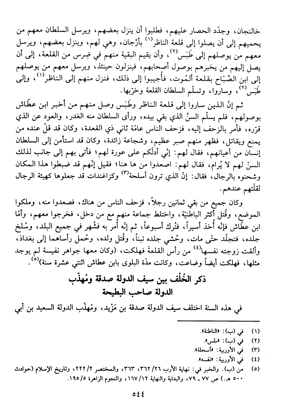 فِي هَذِهِ السَّنَةِ اخْتَلَفَ سَيْفُ الدَّوْلَةِ صَدَقَةُ بْنُ مَزْيَدٍ، وَمُهَذَّبُ الدَّوْلَةِ السَّعِيدُ بْنُ أَبِي
