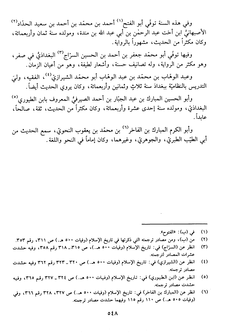 وَأَبُو الْحَسَنِ الْمُبَارَكُ بْنُ عَبْدِ الْجَبَّارِ بْنِ أَحْمَدَ الصَّيْرَفِيُّ الْمَعْرُوفُ بِابْنِ الطُّيُورِيِّ الْبَغْدَاذِيُّ، وَمَوْلِدُهُ سَنَةَ إِحْدَى عَشْرَةَ وَأَرْبَعِمِائَةٍ، وَكَانَ مُكْثِرًا مِنَ الْحَدِيثِ ثِقَةً صَالِحًا عَابِدًا، وَأَبُو الْكَرَمِ الْمُبَارَكُ بْنُ الْفَاخِرِ بْنِ مُحَمَّدِ بْنِ يَعْقُوبَ النَّحْوِيُّ، وَسَمِعَ الْحَدِيثَ مِنْ أَبِي الطَّيِّبِ الطَّبَرِيِّ، وَالْجَوْهَرِيِّ، وَغَيْرِهِمَا، وَكَانَ إِمَامًا فِي النَّحْوِ وَاللُّغَةِ.