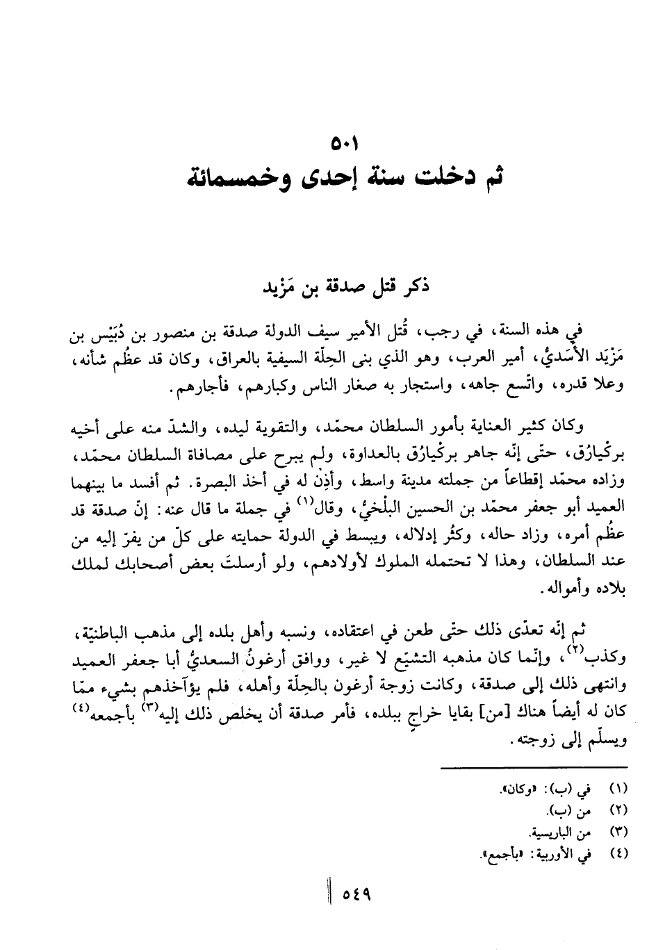 فِي هَذِهِ السَّنَةِ، فِي رَجَبٍ، قُتِلَ الْأَمِيرُ سَيْفُ الدَّوْلَةِ صَدَقَةُ بْنُ مَنْصُورِ بْنِ دُبَيْسِ بْنِ مَزْيَدٍ الْأَسَدِيُّ، أَمِيرُ الْعَرَبِ، وَهُوَ الَّذِي بَنَى الْحِلَّةَ السَّيْفِيَّةَ بِالْعِرَاقِ، وَكَانَ قَدْ عَظُمَ شَأْنُهُ، وَعَلَا قَدْرُهُ، وَاتَّسَعَ جَاهُهُ، وَاسْتَجَارَ بِهِ صِغَارُ النَّاسِ وَكِبَارُهُمْ، فَأَجَارَهُمْ.