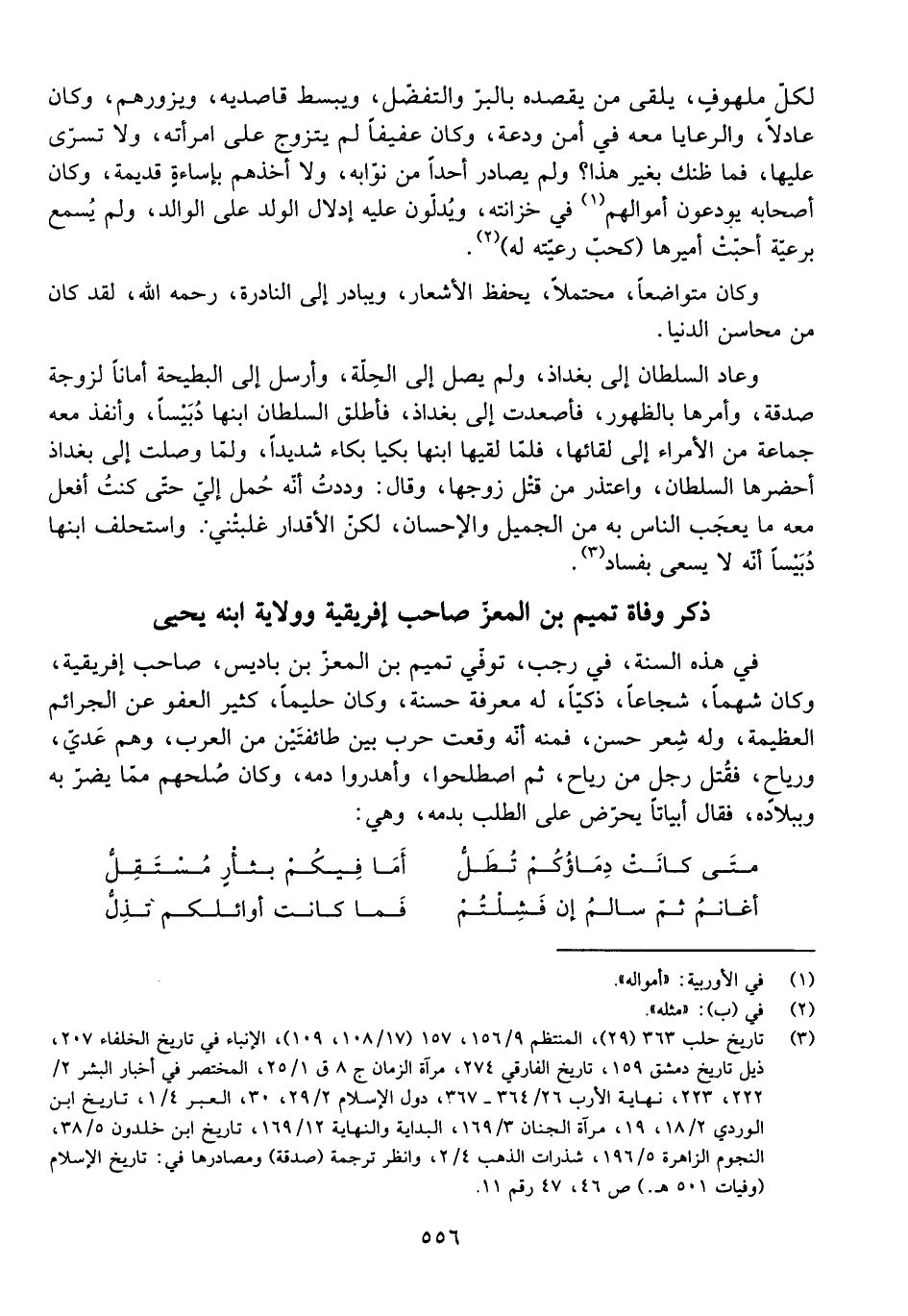 فِي هَذِهِ السَّنَةِ، فِي رَجَبٍ، تُوُفِّيَ تَمِيمُ بْنُ الْمُعِزِّ بْنِ بَادِيسٍ، صَاحِبُ إِفْرِيقِيَّةَ، وَكَانَ شَهْمًا، شُجَاعًا، ذَكِيًّا، لَهُ مَعْرِفَةٌ حَسَنَةٌ، وَكَانَ حَلِيمًا، كَثِيرَ الْعَفْوِ عَنِ الْجَرَائِمِ الْعَظِيمَةِ، وَلَهُ شِعْرٌ حَسَنٌ، فَمِنْهُ أَنَّهُ وَقَعَتْ حَرْبٌ بَيْنَ طَائِفَتَيْنِ مِنَ الْعَرَبِ، وَهُمْ عَدِيٌّ، وَرَيَاحٌ، فَقُتِلَ رَجُلٌ مِنْ رَيَاحٍ، ثُمَّ اصْطَلَحُوا، وَأَهْدَرُوا دَمَهُ، وَكَانَ صُلْحُهُمْ مَا يَضُرُّ بِهِ وَبِبِلَادِهِ، فَقَالَ أَبْيَاتًا يُحَرِّضُ عَلَى الطَّلَبِ بِدَمِهِ، وَهِيَ: