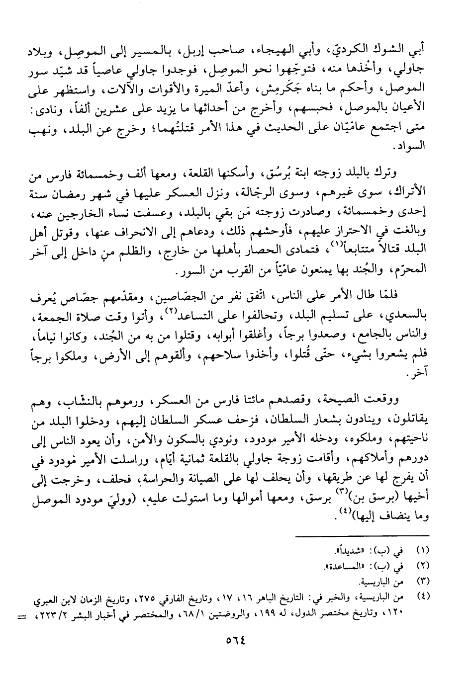 وَوَقَعَتِ الصَّيْحَةُ، وَقَصَدَهُمْ مِائَتَا فَارِسٍ مِنَ الْعَسْكَرِ، وَرَمَوْهُمْ بِالنُّشَّابِ، وَهُمْ يُقَاتِلُونَ، وَيُنَادُونَ بِشِعَارِ السُّلْطَانِ، فَزَحَفَ عَسْكَرُ السُّلْطَانِ إِلَيْهِمْ، وَدَخَلُوا الْبَلَدَ مِنْ نَاحِيَتِهِمْ، وَمَلَكُوهُ، وَدَخَلَهُ الْأَمِيرُ مَوْدُودٌ، وَنُودِيَ بِالسُّكُونِ وَالْأَمْنِ، وَأَنْ يَعُودَ النَّاسُ إِلَى دُورِهِمْ وَأَمْلَاكِهِمْ، وَأَقَامَتْ زَوْجَةُ جَاوْلِي بِالْقَلْعَةِ ثَمَانِيَةَ أَيَّامٍ، وَرَاسَلَتِ الْأَمِيرَ مَوْدُودًا فِي أَنْ يُفْرِجَ لَهَا عَنْ طَرِيقِهَا، وَأَنْ يَحْلِفَ لَهَا عَلَى الصِّيَانَةِ وَالْحِرَاسَةِ، فَحَلَفَ، وَخَرَجَتْ إِلَى أَخِيهَا بُرْسُقَ بْنِ بُرْسُقَ، وَمَعَهَا أَمْوَالُهَا وَمَا اسْتَوْلَتْ عَلَيْهِ وَوَلِيَ مَوْدُودٌ الْمَوْصِلَ وَمَا يَنْضَافُ إِلَيْهَا.