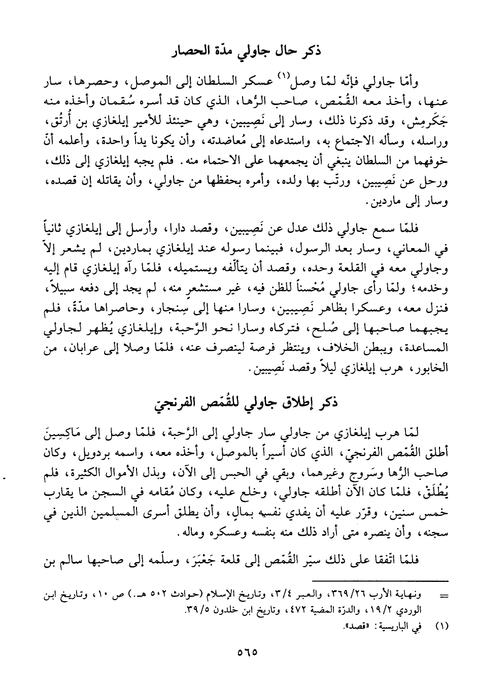 وَأَمَّا جَاوْلِي فَإِنَّهُ لَمَّا وَصَلَ عَسْكَرُ السُّلْطَانِ، وَحَصَرَهَا، سَارَ عَنْهَا، وَأَخَذَ مَعَهُ الْقُمَّصَ، صَاحِبَ الرُّهَا، الَّذِي كَانَ قَدْ أَسَرَهُ سَقْمَانُ وَأَخَذَهُ مِنْهُ جَكَرْمِشُ، وَقَدْ ذَكَرْنَا ذَلِكَ، وَسَارَ إِلَى نَصِيبِينَ، وَهِيَ حِينَئِذٍ لِلْأَمِيرِ إِيلْغَازِي بْنِ أُرْتُقَ، وَرَاسَلَهُ وَسَأَلَهُ الِاجْتِمَاعَ بِهِ، وَاسْتَدْعَاهُ إِلَى مُعَاضَدَتِهِ، وَأَنْ يَكُونَا يَدًا وَاحِدَةً، وَأَعْلَمَهُ أَنَّ خَوْفَهُمَا مِنَ السُّلْطَانِ يَنْبَغِي أَنْ يَجْمَعَهُمَا عَلَى الِاحْتِمَاءِ مِنْهُ. فَلَمْ يُجِبْهُ إِيلْغَازِي إِلَى ذَلِكَ، وَرَحَلَ عَنْ نَصِبِينَ، وَرَتَّبَ بِهَا وَلَدَهُ، وَأَمَرَهُ بِحِفْظِهَا مِنْ جَاوْلِي، وَأَنْ يُقَاتِلَهُ إِنْ قَصَدَهُ، وَسَارَ إِلَى مَارِدِينَ.