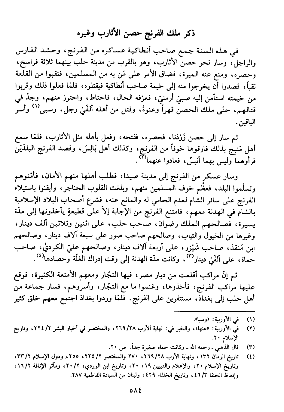 فِي هَذِهِ السَّنَةِ جَمَعَ صَاحِبُ أَنْطَاكِيَةَ عَسَاكِرَهُ مِنَ الْفِرِنْجِ، وَحَشَدَ الْفَارِسَ وَالرَّاجِلَ، وَسَارَ نَحْوَ حِصْنِ الْأَثَارِبِ، وَهُوَ بِالْقُرْبِ مِنْ مَدِينَةِ حَلَبَ بَيْنَهُمَا ثَلَاثَةُ فَرَاسِخَ، وَحَصَرَهُ، وَمَنَعَ عَنْهُ الْمِيرَةَ، فَضَاقَ الْأَمْرُ عَلَى مَنْ بِهِ مِنَ الْمُسْلِمِينَ، فَنَقَبُوا بِالْقَلْعَةِ نَقْبًا، قَصَدُوا أَنْ يَخْرُجُوا مِنْهُ إِلَى خَيْمَةِ صَاحِبِ أَنْطَاكِيَةَ فَيَقْتُلُوهُ، فَلَمَّا فَعَلُوا ذَلِكَ وَقَرُبُوا مِنْ خَيْمَتِهِ اسْتَأْمَنَ إِلَيْهِ صَبِيٌّ أَرْمِنِيٌّ، فَعَرَّفَهُ الْحَالَ، فَاحْتَاطَ، وَاحْتَرَزَ مِنْهُمْ، وَجَدَّ فِي قِتَالِهِمْ، حَتَّى مَلَكَ الْحِصْنَ قَهْرًا وَعَنْوَةً، وَقَتَلَ مِنْ أَهْلِهِ أَلْفَيْ رَجُلٍ، وَسَبَى وَأَسَرَ الْبَاقِينَ.