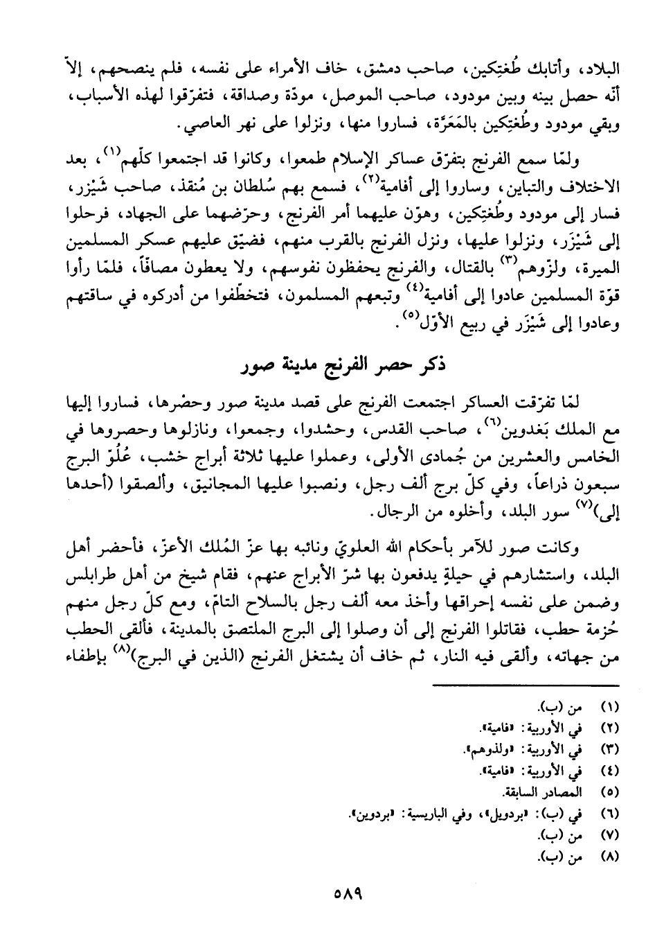 لَمَّا تَفَرَّقَتِ الْعَسَاكِرُ اجْتَمَعَتِ الْفِرِنْجُ عَلَى قَصْدِ مَدِينَةِ صُورَ وَحَصْرِهَا، فَسَارُوا إِلَى الْمَلِكِ بَغْدُوِينَ، صَاحِبِ الْقُدْسِ، وَحَشَدُوا، وَجَمَعُوا، وَنَازَلُوهَا وَحَاصَرُوهَا فِي الْخَامِسِ وَالْعِشْرِينَ مِنْ جُمَادَى الْأُولَى، وَعَمِلُوا عَلَيْهَا ثَلَاثَةَ أَبْرَاجِ خَشَبٍ، عُلُوُّ الْبُرْجِ سَبْعُونَ ذِرَاعًا، وَفِي كُلِّ بُرْجٍ أَلْفٌ رَجُلٍ، وَنَصَبُوا عَلَيْهَا الْمَجَانِيقَ، وَأَلْصَقُوا أَحَدَهَا إِلَى سُورِ الْبَلَدِ، وَأَخْلَوْهُ مِنَ الرِّجَالِ.