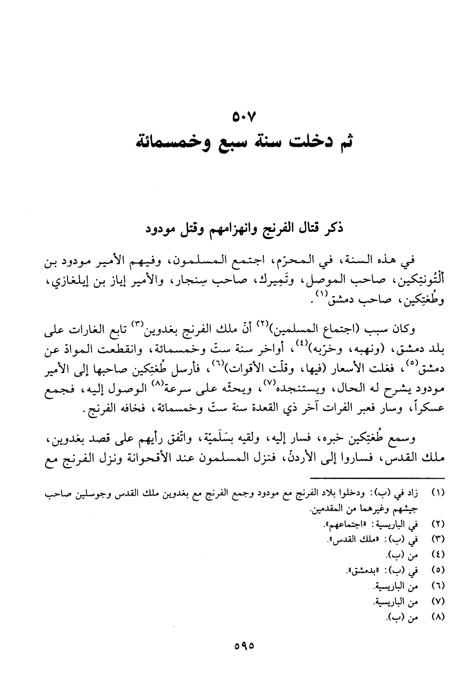 ثُمَّ دَخَلَتْ سَنَةُ سَبْعٍ وَخَمْسِمِائَةٍ ذِكْرُ قِتَالِ الْفِرِنْجِ وَانْهِزَامِهِمْ وَقَتْلِ مَوْدُودٍ