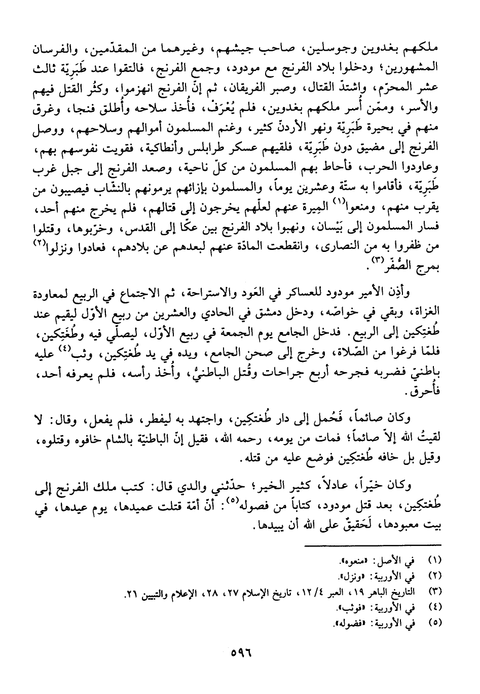 مَلِكِهِمْ بَغْدُوِينَ وَجُوسْلِينَ، صَاحِبِ جَيْشِهِمْ، وَغَيْرِهِمَا مِنَ الْمُقَدَّمَيْنِ، وَالْفُرْسَانِ الْمَشْهُورِينَ، وَدَخَلُوا بِلَادَ الْفِرِنْجِ مَعَ مَوْدُودٍ، وَجَمَعَ الْفِرِنْجُ، فَالْتَقَوْا عِنْدَ طَبَرِيَّةَ ثَالِثَ عَشَرَ مِنَ الْمُحَرَّمِ، وَاشْتَدَّ الْقِتَالُ، وَصَبَرَ الْفَرِيقَانِ، ثُمَّ إِنَّ الْفِرِنْجَ انْهَزَمُوا، وَكَثُرَ الْقَتْلُ فِيهِمْ وَالْأَسْرُ، وَمِمَّنْ أُسِرَ مَلِكُهُمْ بَغْدُوِينُ، فَلَمْ يُعْرَفْ، فَأَخَذَ سِلَاحَهُ وَأُطْلِقَ فَنَجَا، وَغَرِقَ مِنْهُمْ فِي بُحَيْرَةِ طَبَرِيَّةَ وَنَهْرِ الْأُرْدُنِّ كَثِيرٌ، وَغَنِمَ الْمُسْلِمُونَ أَمْوَالَهُمْ وَسِلَاحَهُمْ، وَوَصَلَ الْفِرِنْجُ إِلَى مَضِيقٍ دُونَ طَبَرِيَّةَ، فَلَقِيَهُمْ عَسْكَرُ طَرَابُلُسَ وَأَنْطَاكِيَةَ، فَقَوِيَتْ نُفُوسُهُمْ بِهِمْ، وَعَاوَدُوا الْحَرْبَ، فَأَحَاطَ بِهِمُ الْمُسْلِمُونَ مِنْ كُلِّ نَاحِيَةٍ، وَصَعِدَ الْفِرِنْجُ إِلَى جَبَلٍ غَرْبَ طَبَرِيَّةَ، فَأَقَامُوا بِهِ سِتَّةً وَعِشْرِينَ يَوْمًا، وَالْمُسْلِمُونَ بِإِزَائِهِمْ يَرْمُونَهُمْ بِالنُّشَّابِ فَيُصِيبُونَ مَنْ يَقْرُبُ مِنْهُمْ، وَمَنَعُوا الْمِيرَةَ عَنْهُمْ لَعَلَّهُمْ يَخْرُجُونَ إِلَى قِتَالِهِمْ، فَلَمْ يَخْرُجْ مِنْهُمْ أَحَدٌ، فَسَارَ الْمُسْلِمُونَ إِلَى بَيْسَانَ، وَنَهَبُوا بِلَادَ الْفِرِنْجِ بَيْنَ عَكًّا إِلَى الْقُدْسِ، وَخَرَّبُوهَا، وَقَتَلُوا مَنْ ظَفِرُوا بِهِ مِنَ النَّصَارَى، وَانْقَطَعَتِ الْمَادَّةُ عَنْهُمْ لِبُعْدِهِمْ عَنْ بِلَادِهِمْ، فَعَادُوا وَنَزَلُوا بِمَرْجِ الصُّفَّرِ.