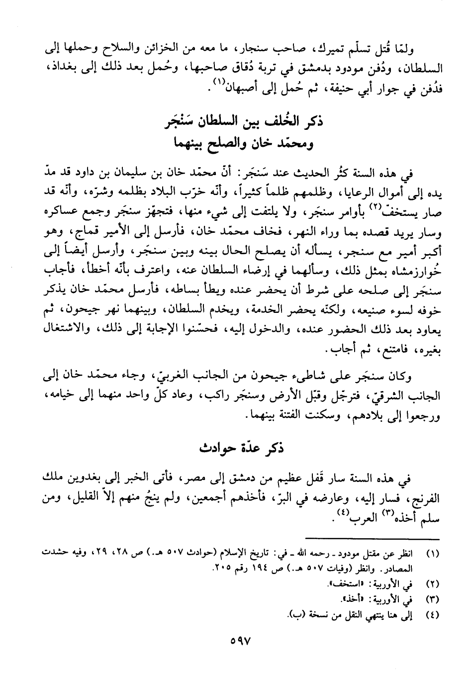 فِي هَذِهِ السَّنَةِ كَثُرَ الْحَدِيثُ عَنْ سَنْجَرَ: أَنَّ مُحَمَّدْ خَانَ بْنَ سُلَيْمَانَ بْنِ دَاوُدَ قَدْ مَدَّ يَدَهُ إِلَى أَمْوَالِ الرَّعَايَا، وَظَلَمَهُمْ ظُلْمًا كَثِيرًا، وَأَنَّهُ خَرَّبَ الْبِلَادَ بِظُلْمِهِ وَشَرِّهِ، وَأَنَّهُ قَدْ صَارَ يَسْتَخِفُّ بِأَوَامِرِ سَنْجَرَ، وَلَا يَلْتَفِتُ إِلَى شَيْءٍ مِنْهَا، فَتَجَهَّزَ سَنْجَرُ وَجَمَعَ عَسَاكِرَهُ وَسَارَ يُرِيدُ قَصْدَهُ بِمَا وَرَاءَ النَّهْرِ، فَخَافَ مُحَمَّدْ خَانْ، فَأَرْسَلَ إِلَى الْأَمِيرِ قُمَاجَ، وَهُوَ أَكْبَرُ أَمِيرٍ مَعَ سَنْجَرَ، يَسْأَلُهُ أَنْ يُصْلِحَ الْحَالَ بَيْنَهُ وَبَيْنَ سَنْجَرَ، وَأَرْسَلَ أَيْضًا إِلَى خُوَارَزْمِشَاهْ بِمِثْلِ ذَلِكَ، وَسَأَلَهُمَا فِي إِرْضَاءِ السُّلْطَانِ عَنْهُ، وَاعْتَرَفَ بِأَنَّهُ أَخْطَأَ، فَأَجَابَ سَنْجَرُ إِلَى صُلْحِهِ عَلَى شَرْطِ أَنْ يَحْضُرَ عِنْدَهُ وَيَطَأَ بِسَاطَهُ، فَأَرْسَلَ مُحَمَّدْ خَانْ يَذْكُرُ خَوْفَهُ لِسُوءِ صَنِيعِهِ، وَلَكِنَّهُ يَحْضُرُ الْخِدْمَةَ، وَيَخْدِمُ السُّلْطَانَ، وَبَيْنَهُمَا نَهْرُ جَيْحُونَ، ثُمَّ يُعَاوِدُ بَعْدَ ذَلِكَ الْحُضُورَ عِنْدَهُ، وَالدُّخُولَ إِلَيْهِ، فَحَسَّنُوا الْإِجَابَةَ إِلَى ذَلِكَ، وَالِاشْتِغَالَ بِغَيْرِهِ، فَامْتَنَعَ، ثُمَّ أَجَابَ.