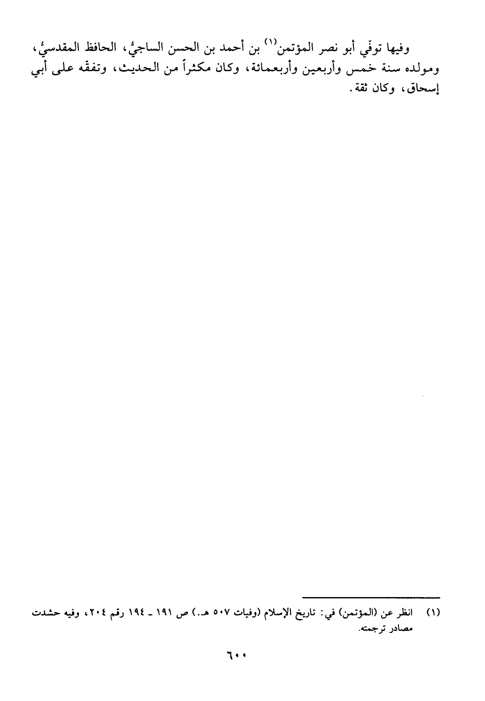 وَفِيهَا تُوُفِّيَ أَبُو نَصْرٍ الْمُؤْتَمَنُ بْنُ أَحْمَدَ بْنِ الْحَسَنِ السَّاجِيُّ، الْحَافِظُ الْمَقْدِسِيُّ، وَمَوْلِدُهُ سَنَةَ خَمْسٍ وَأَرْبَعِينَ وَأَرْبَعِمِائَةٍ، وَكَانَ مُكْثِرًا مِنَ الْحَدِيثِ، وَتَفَقَّهَ عَلَى أَبِي إِسْحَاقَ، وَكَانَ ثِقَةً.