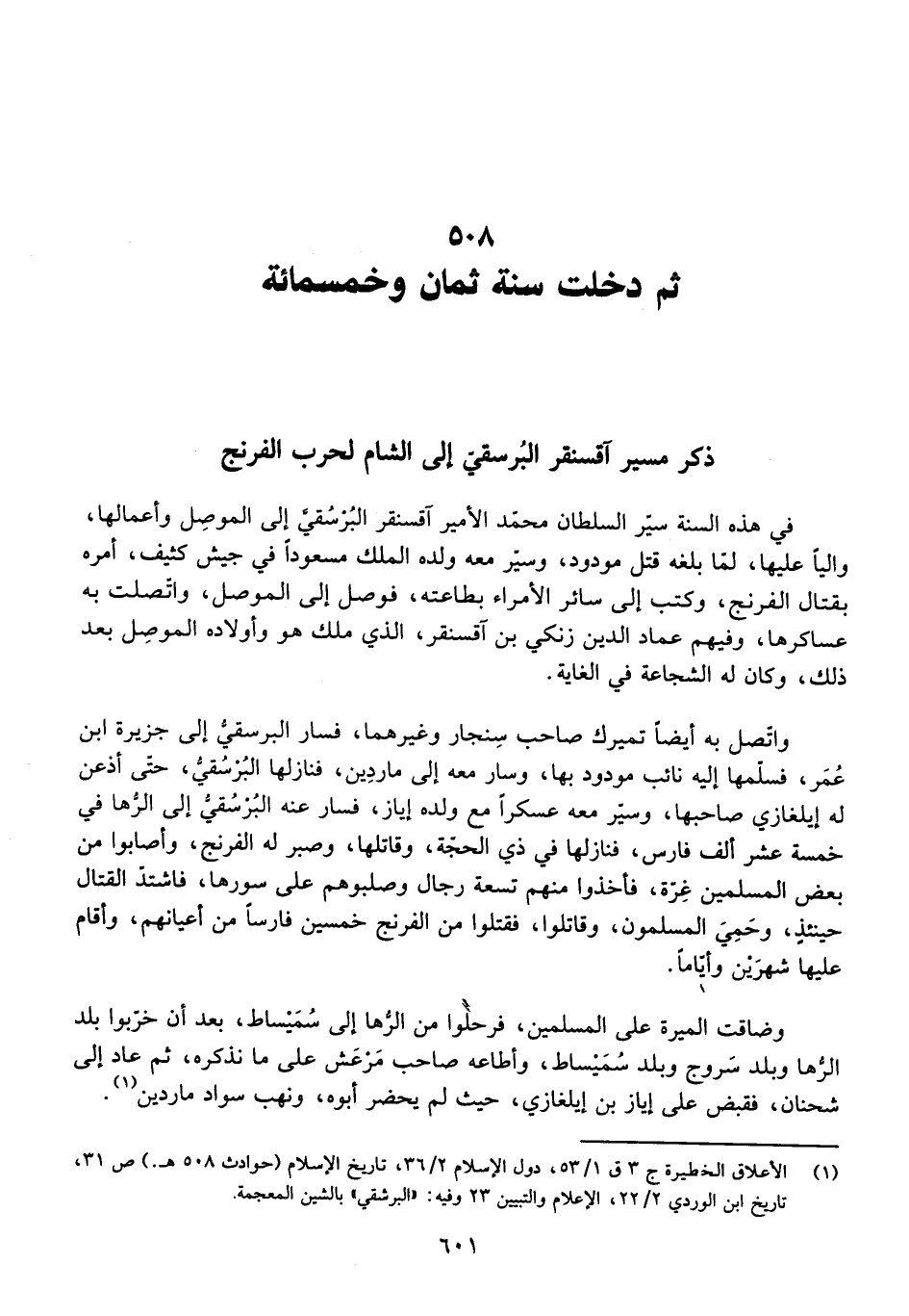 ثُمَّ دَخَلَتْ سَنَةُ ثَمَانٍ وَخَمْسِمِائَةٍ ذِكْرُ مَسِيرِ آقْسُنْقُرَ الْبُرْسُقِيِّ إِلَى الشَّامِ لِحَرْبِ الْفِرِنْجِ