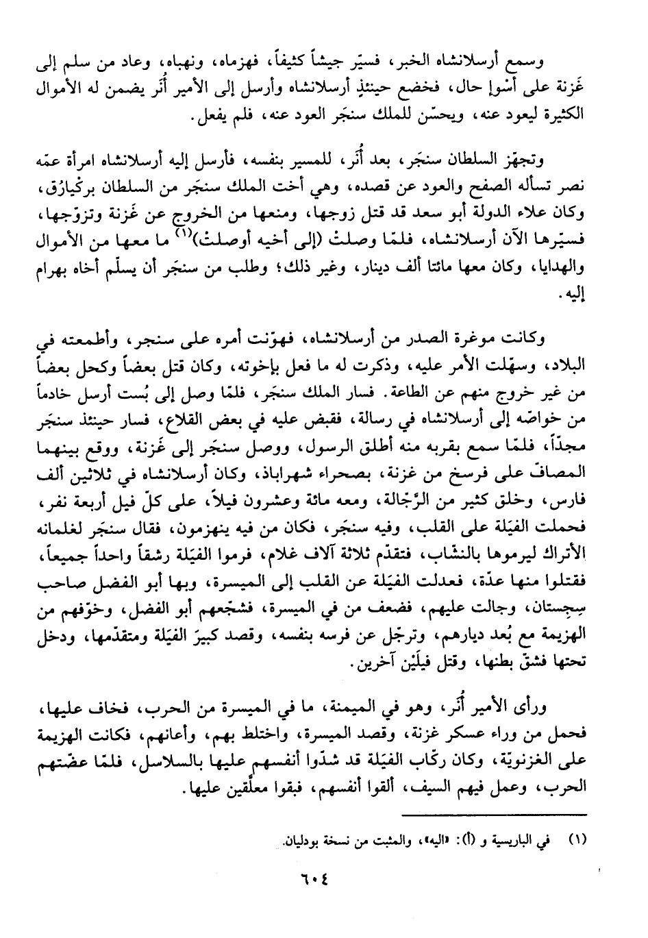 وَكَانَتْ مُوغَرَةَ الصَّدْرِ مِنْ أَرْسِلَانْشَاهْ، فَهَوَّنَتْ أَمْرَهُ عَلَى سَنْجَرَ، وَأَطْمَعَتْهُ فِي الْبِلَادِ، وَسَهَّلَتِ الْأَمْرَ عَلَيْهِ، وَذَكَرَتْ لَهُ مَا فَعَلَ بِإِخْوَانِهِ، وَكَانَ قَتَلَ بَعْضًا وَكَحَلَ بَعْضًا مِنْ غَيْرِ خُرُوجٍ مِنْهُمْ عَنِ الطَّاعَةِ. فَسَارَ الْمَلِكُ سَنْجَرُ، فَلَمَّا وَصَلَ إِلَى بُسْتَ أَرْسَلَ خَادِمًا مِنْ خَوَاصِّهِ إِلَى أَرْسِلَانْشَاهْ فِي رِسَالَةٍ، فَقَبَضَ عَلَيْهِ فِي بَعْضِ الْقِلَاعِ، فَسَارَ حِينَئِذٍ سَنْجَرُ مُجِدًّا، فَلَمَّا سَمِعَ مِنْهُ أَطْلَقَ الرَّسُولَ، وَوَصَلَ سَنْجَرُ إِلَى غَزْنَةَ، وَوَقَعَ بَيْنَهُمَا الْمَصَافُّ عَلَى فَرْسَخٍ مِنْ غَزْنَةَ، بِصَحْرَاءَ شَهْرَابَاذَ، وَكَانَ أَرْسِلَانْشَاهْ فِي ثَلَاثِينَ أَلْفَ فَارِسٍ، وَخَلْقٍ كَثِيرٍ مِنَ الرَّجَّالَةِ، وَمَعَهُ مِائَةٌ وَعِشْرُونَ فِيلًا، عَلَى كُلِّ فِيلٍ أَرْبَعَةُ نَفَرٍ، فَحَمَلَتِ الْفِيَلَةُ عَلَى الْقَلْبِ، وَفِيهِ سَنْجَرُ، فَكَانَ مَنْ فِيهِ يَنْهَزِمُونَ، فَقَالَ سَنْجَرُ لِغِلْمَانِهِ الْأَتْرَاكِ لِيَرْمُوهَا بِالنُّشَّابِ، فَتَقَدَّمَ ثَلَاثَةُ آلَافِ غُلَامٍ، فَرَمَوُا الْفِيَلَةَ رَشْقًا وَاحِدًا جَمِيعًا، فَقَتَلُوا مِنْهَا عِدَّةً، فَعَدَلَتِ الْفِيَلَةُ عَنِ الْقَلْبِ إِلَى الْمَيْسَرَةِ، وَبِهَا أَبُو الْفَضْلِ صَاحِبُ سِجِسْتَانَ، وَجَالَتْ عَلَيْهِمْ، فَضَعُفَ مَنْ فِي الْمَيْسَرَةِ، فَشَجَّعَهُمْ أَبُو الْفَضْلِ، وَخَوَّفَهُمْ مِنَ الْهَزِيمَةِ مَعَ دِيَارِهِمْ، وَتَرَجَّلَ عَنْ فَرَسِهِ بِنَفْسِهِ، وَقَصَدَ كَبِيرَ الْفِيَلَةِ، وَمُتَقَدَّمُهَا، وَدَخَلَ تَحْتَهَا فَشَقَّ بَطْنَهَا، وَقَتَلَ فِيلَيْنِ آخَرَيْنِ.