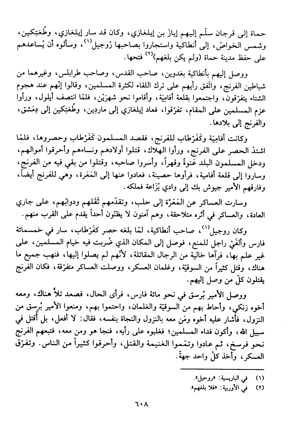 وَوَصَلَ الْأَمِيرُ بُرْسُقُ فِي نَحْوِ مِائَةِ فَارِسٍ، فَرَأَى الْحَالَ وَصَعِدَ تَلًّا هُنَاكَ، وَمَعَهُ أَخُوهُ زِنْكِيٌّ، وَأَحَاطَ بِهِمْ مِنَ السُّوقِيَّةِ وَالْغِلْمَانِ، وَاحْتَمَوْا بِهِمْ، وَمَنَعُوا الْأَمِيرَ بُرْسُقَ مِنَ النُّزُولِ، فَأَشَارَ عَلَيْهِ أَخُوهُ وَمَنْ مَعَهُ بِالنُّزُولِ وَالنَّجَاةِ بِنَفْسِهِ، فَقَالَ: لَا أَفْعَلُ، بَلْ أُقْتَلُ فِي سَبِيلِ اللَّهِ، وَأَكُونُ فِدَاءَ الْمُسْلِمِينَ، فَغَلَبُوهُ عَلَى رَأْيِهِ، فَنَجَا هُوَ وَمَنْ مَعَهُ، فَتَبِعَهُمُ الْفِرِنْجُ نَحْوَ فَرْسَخٍ، ثُمَّ عَادُوا وَتَمَّمُوا الْغَنِيمَةَ وَالْقَتْلَ، وَأَحْرَقُوا كَثِيرًا مِنَ النَّاسِ.