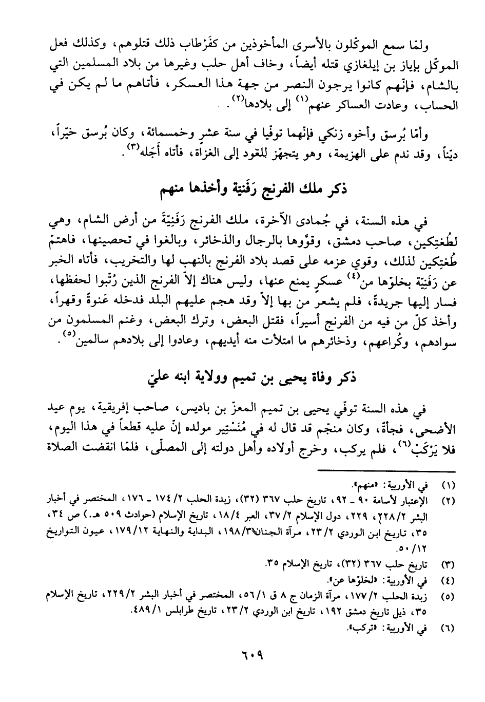 فِي هَذِهِ السَّنَةِ، فِي جُمَادَى الْآخِرَةِ، مَلَكَ الْفِرِنْجُ رَفَنِيَّةَ مِنْ أَرْضِ الشَّامِ وَهِيَ لِطُغْتِكِينَ، صَاحِبِ دِمَشْقَ، وَقَوَّوْهَا بِالرِّجَالِ وَالذَّخَائِرِ، وَبَالَغُوا فِي تَحْصِينِهَا، فَاهْتَمَّ طُغْتِكِينُ لِذَلِكَ، وَقَوِيَ عَزْمُهُ عَلَى قَصْدِ بِلَادِ الْفِرِنْجِ بِالنَّهْبِ لَهَا وَالتَّخْرِيبِ، فَأَتَاهُ الْخَبَرُ عَنْ رَفَنِيَّةَ بِخُلُوِّهَا مِنْ عَسْكَرٍ يَمْنَعُ عَنْهَا، وَلَيْسَ هُنَاكَ إِلَّا الْفِرِنْجُ الَّذِينَ رَتَّبُوا لِحِفْظِهَا، فَسَارَ إِلَيْهَا جَرِيدَةً، فَلَمْ يَشْعُرْ مَنْ بِهَا إِلَّا وَقَدْ هَجَمَ عَلَيْهِمُ الْبَلَدَ فَدَخَلَهُ عَنْوَةً وَقَهَرًا، وَأَخَذَ كُلَّ مَنْ فِيهِ مِنَ الْفِرِنْجِ أَسِيرًا، فَقَتَلَ الْبَعْضَ، وَتَرَكَ الْبَعْضَ وَغَنِمَ الْمُسْلِمُونَ مِنْ سَوَادِهِمْ، وَكُرَاعِهِمْ، وَذَخَائِرِهِمْ مَا امْتَلَأَتْ مِنْهُ أَيْدِيهِمْ، وَعَادُوا إِلَى بِلَادِهِمْ سَالِمِينَ.