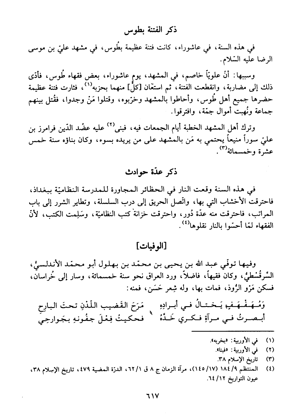 فِي هَذِهِ السَّنَةِ، فِي عَاشُورَاءَ، كَانَتْ فِتْنَةٌ عَظِيمَةٌ بِطُوسَ، فِي مَشْهَدِ عَلِيِّ بْنِ مُوسَى الرِّضَا عَلَيْهِ السَّلَامُ.