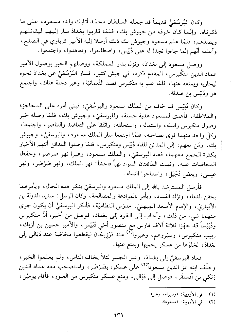 فَعَادَ الْبُرْسُقِيُّ إِلَى بَغْدَاذَ، وَعَبَرَ الْجِسْرَ لِئَلَّا يَخَافَ النَّاسُ، وَلَمْ يَعْلَمُوا الْخَبَرَ وَخَلَّفَ ابْنَهُ عِزَّ الدِّينِ مَسْعُودًا عَلَى عَسْكَرِهِ بِصَرْصَرَ، وَاسْتَصْحَبَ مَعَهُ عِمَادَ الدِّينِ زِنْكِيَّ بْنَ آقْسُنْقُرَ، فَوَصَلَ إِلَى دَيَالَى، وَمَنَعَ عَسْكَرَ مَنْكُبَرْسَ مِنَ الْعُبُورِ، فَأَقَامَ يَوْمَيْنِ،