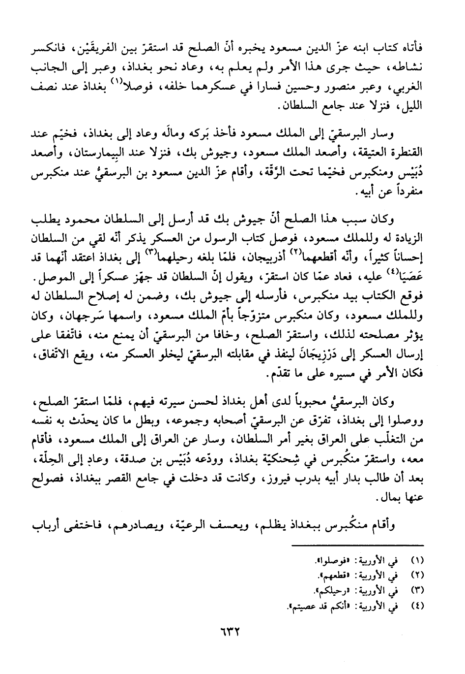 وَسَارَ الْبُرْسُقِيُّ إِلَى الْمَلِكِ مَسْعُودٍ فَأَخَذَ بَرَكَهُ وَمَالَهُ وَعَادَ إِلَى بَغْدَاذَ فَخَيَّمَ عِنْدَ الْقَنْطَرَةِ الْعَتِيقَةِ، وَأَصْعَدَ الْمَلِكُ مَسْعُودٌ، وَجُيُوشْ بِكْ، فَنَزَلَا عِنْدَ الْبِيمَارِسْتَانِ، وَأَصْعَدَ دُبَيْسٌ وَمَنْكُبَرْسُ فَخَيَّمَا تَحْتَ الرَّقَّةِ، وَأَقَامَ عِزُّ الدِّينِ مَسْعُودُ بْنُ الْبُرْسُقِيِّ عِنْدَ مَنْكُبَرْسَ مُنْفَرِدًا عَنْ أَبِيهِ.