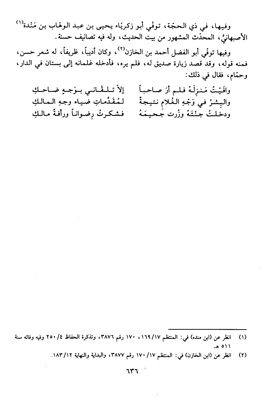 وَفِيهَا تُوُفِّيَ أَبُو الْفَضْلِ أَحْمَدُ بْنُ الْخَازِنِ، وَكَانَ أَدِيبًا، ظَرِيفًا، لَهُ شِعْرٌ حَسَنٌ، فَمِنْهُ قَوْلُهُ، وَقَدْ قَصَدَ زِيَارَةَ صَدِيقٍ لَهُ، فَلَمْ يَرَهُ، فَأَدْخَلَهُ غِلْمَانُهُ إِلَى بُسْتَانٍ فِي الدَّارِ، وَحَمَّامٍ، فَقَالَ فِي ذَلِكَ: