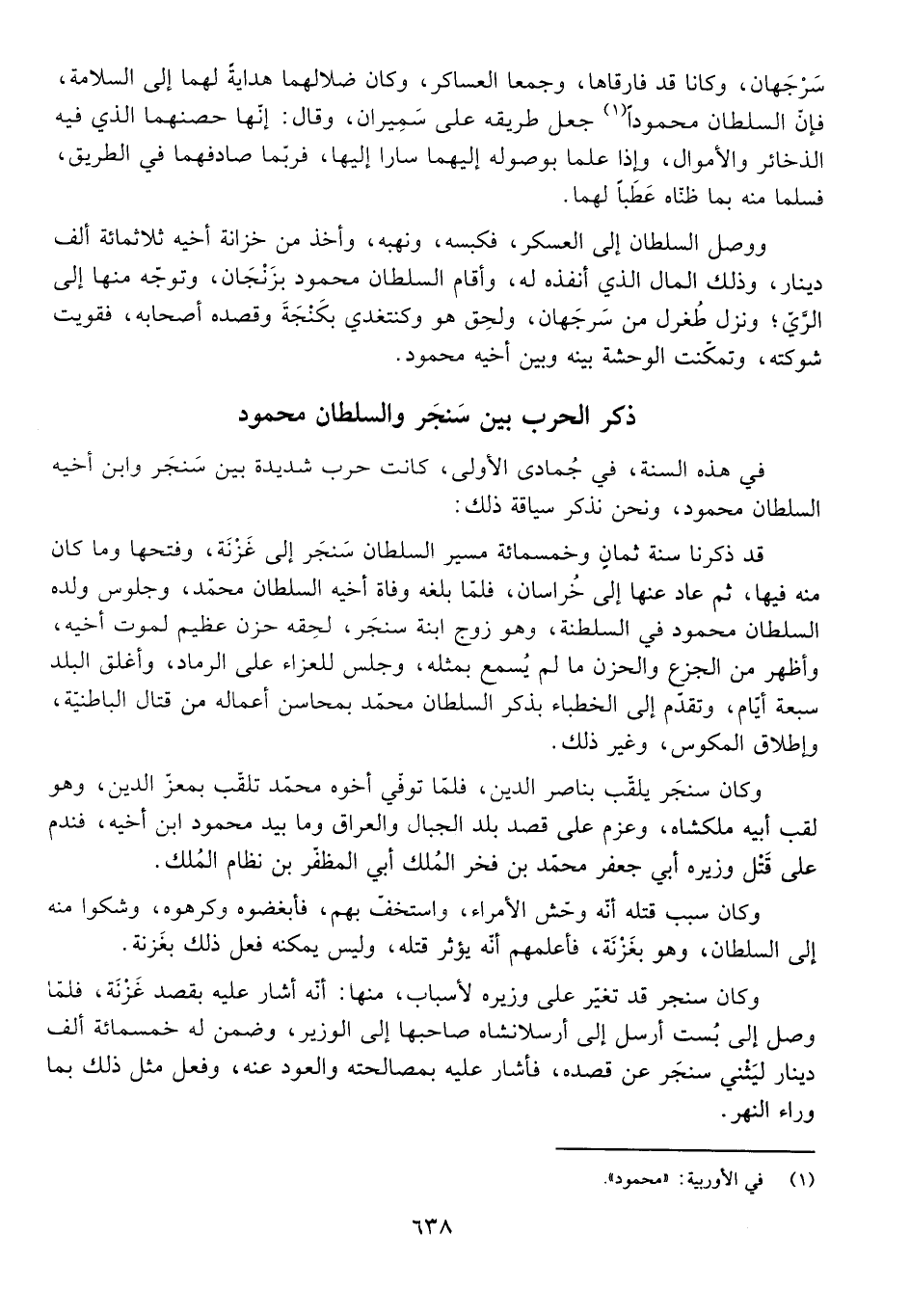 فِي هَذِهِ السَّنَةِ، فِي جُمَادَى الْأُولَى، كَانَتْ حَرْبٌ شَدِيدَةٌ بَيْنَ سَنْجَرَ وَابْنِ أَخِيهِ السُّلْطَانِ مَحْمُودٍ، وَنَحْنُ نَذْكُرُ سِيَاقَةَ ذَلِكَ: