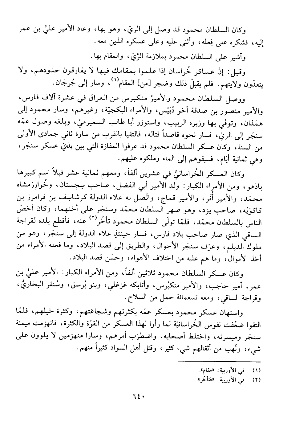 وَكَانَ الْعَسْكَرُ الْخُرَاسَانِيُّ فِي عِشْرِينَ أَلْفًا، وَمَعَهُمْ ثَمَانِيَةَ عَشَرَ فِيلًا اسْمُ كَبِيرِهَا بَاذْهُو، وَمِنَ الْأُمَرَاءِ الْكِبَارِ: وَلَدُ الْأَمِيرِ أَبِي الْفَضْلِ، صَاحِبُ سِجِسْتَانَ، وَخَوَارَزْمُشَاهْ مُحَمَّدٌ، وَالْأَمِيرُ أُنَرُ، وَالْأَمِيرُ قُمَاجُ، وَاتَّصَلَ بِهِ عَلَاءُ الدَّوْلَةِ كَرَشَاسِفُ بْنُ فَرَامَرْزَ بْنِ كَاكَوَيْهِ، صَاحِبُ يَزْدَ، وَهُوَ صِهْرُ السُّلْطَانِ مُحَمَّدٍ وَسَنْجَرَ عَلَى أُخْتِهِمَا، وَكَانَ أَخَصَّ النَّاسِ بِالسُّلْطَانِ مُحَمَّدٍ، فَلَمَّا تَوَلَّى السُّلْطَانُ مَحْمُودٌ تَأَخَّرَ عَنْهُ، فَأَقْطَعَ بَلَدَهُ لِقُرَاجَةَ السَّاقِي الَّذِي صَارَ صَاحِبَ بِلَادِ فَارِسٍ، فَسَارَ حِينَئِذٍ عَلَاءُ الدَّوْلَةِ إِلَى سَنْجَرَ، وَهُوَ مِنْ مُلُوكِ الدَّيْلَمِ، وَعَرَّفَ سَنْجَرَ الْأَحْوَالَ، وَالطَّرِيقَ إِلَى قَصْدِ الْبِلَادِ، وَمَا فَعَلَهُ الْأُمَرَاءُ مِنْ أَخْذِ الْأَمْوَالِ، وَمَا هُمْ عَلَيْهِ مِنِ اخْتِلَافِ الْأَهْوَاءِ وَحَسَّنَ قَصْدَ الْبِلَادِ.
