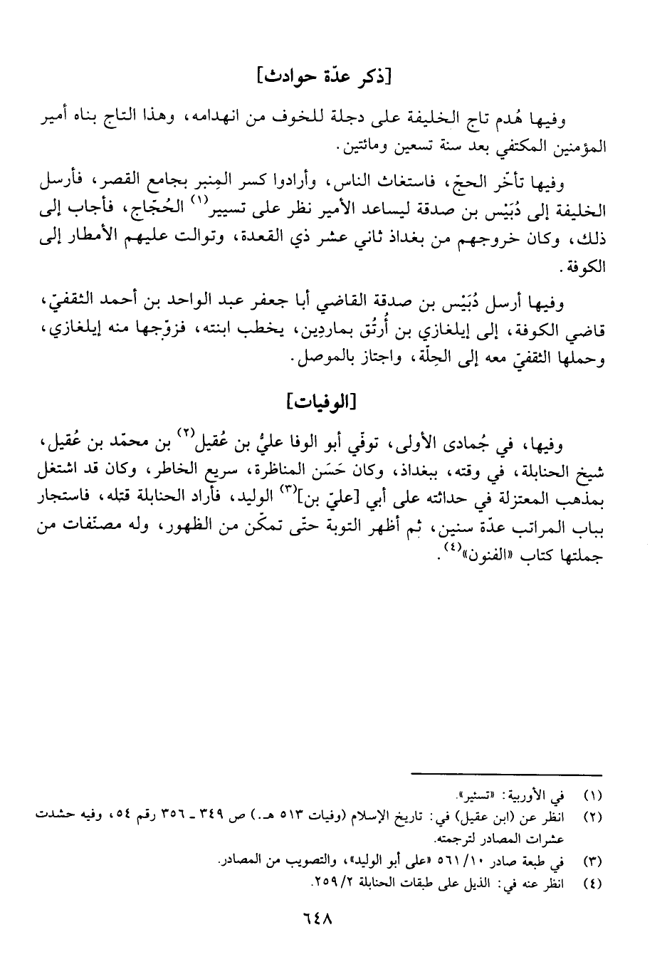 وَفِيهَا، فِي جُمَادَى الْأُولَى، تُوُفِّيَ أَبُو الْوَفَا عَلِيُّ بْنُ عَقِيلِ بْنِ مُحَمَّدِ بْنِ عَقِيلٍ، شَيْخُ الْحَنَابِلَةِ، فِي وَقْتِهِ، بِبَغْدَاذَ، وَكَانَ حَسَنَ الْمُنَاظَرَةِ، سَرِيعَ الْخَاطِرِ، وَكَانَ قَدِ اشْتَغَلَ بِمَذْهَبِ الْمُعْتَزِلَةِ فِي حَدَاثَتِهِ عَلَى أَبِي الْوَلِيدِ، فَأَرَادَ الْحَنَابِلَةُ قَتْلَهُ، فَاسْتَجَارَ بِبَابِ الْمَرَاتِبِ عِدَّةَ سِنِينَ، ثُمَّ أَظْهَرَ التَّوْبَةَ حَتَّى تَمَكَّنَ مِنَ الظُّهُورِ، وَلَهُ مُصَنَّفَاتُ مِنْ جُمَلْتِهَا كِتَابُ الْفُنُونِ.
