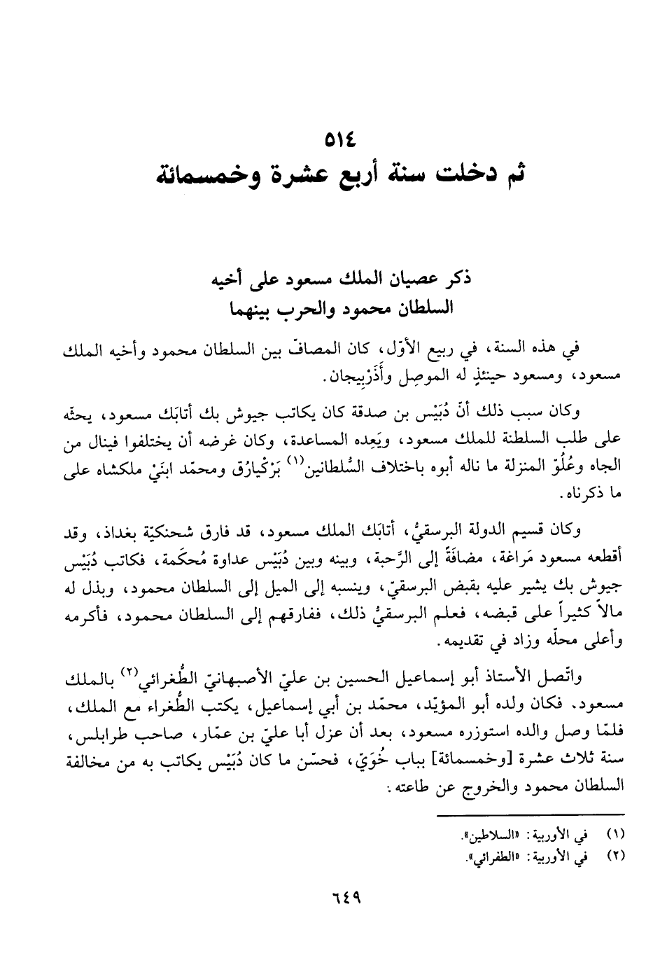 ثُمَّ دَخَلَتْ سَنَةُ أَرْبَعَ عَشْرَةَ وَخَمْسِمِائَةٍ ذِكْرُ عِصْيَانِ الْمَلِكِ مَسْعُودٍ عَلَى أَخِيهِ السُّلْطَانِ مَحْمُودٍ وَالْحَرْبِ بَيْنَهُمَا