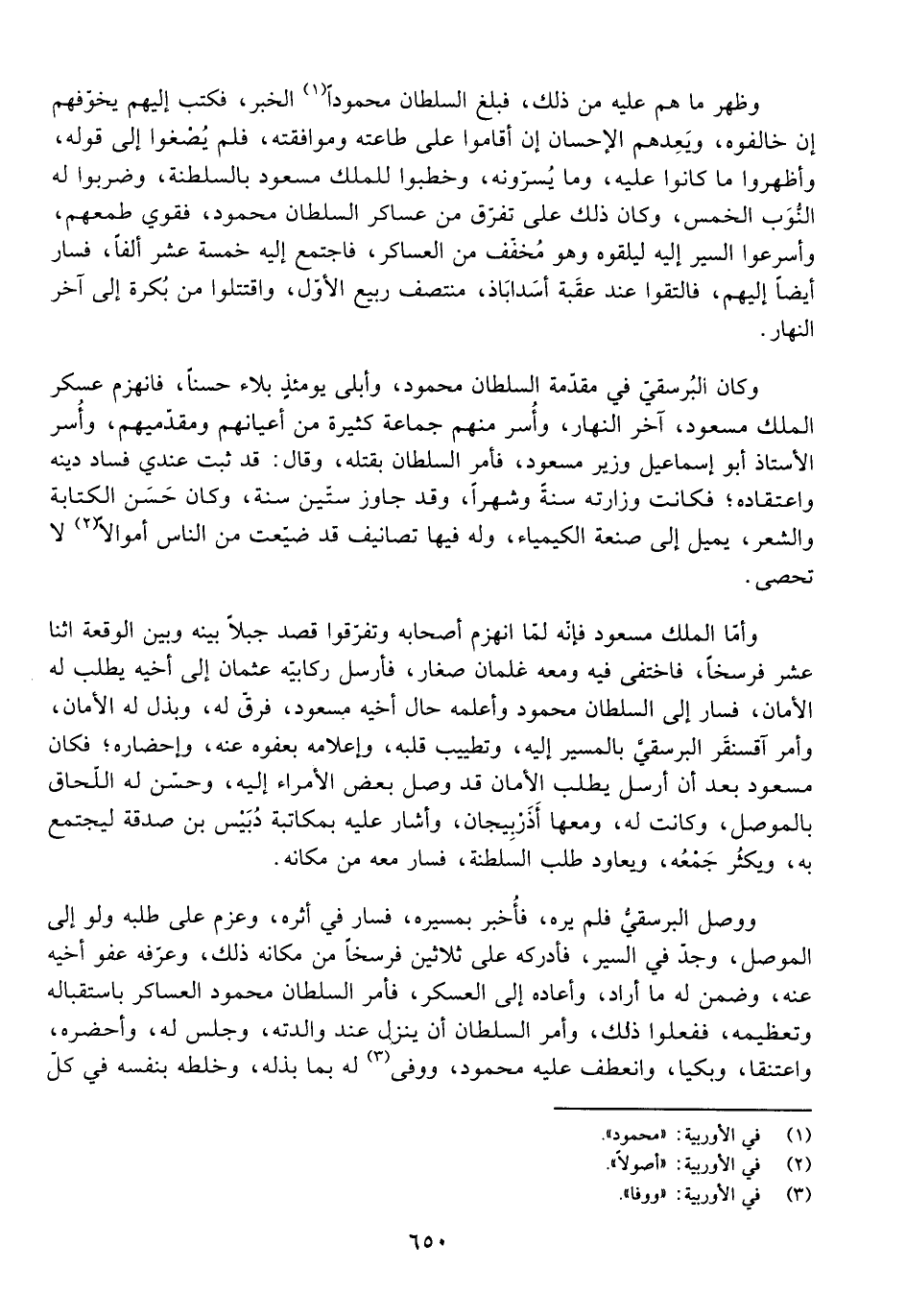 وَوَصَلَ الْبُرْسُقِيُّ فَلَمْ يَرَهُ، فَأَخْبَرَهُ بِمَسِيرِهِ، فَسَارَ فِي أَثَرِهِ، وَعَزَمَ عَلَى طَلَبِهِ وَلَوْ إِلَى الْمَوْصِلِ، وَجَدَّ فِي السَّيْرِ، فَأَدْرَكَهُ عَلَى ثَلَاثِينَ فَرْسَخًا مِنْ مَكَانِهِ ذَلِكَ، وَعَرَّفَهُ عَفْوَ أَخِيهِ عَنْهُ، وَضَمِنَ لَهُ مَا أَرَادَ، وَأَعَادَهُ إِلَى الْعَسْكَرِ، فَأَمَرَ السُّلْطَانُ مَحْمُودٌ الْعَسَاكِرَ بِاسْتِقْبَالِهِ وَتَعْظِيمِهِ، فَفَعَلُوا ذَلِكَ، وَأَمَرَ السُّلْطَانُ أَنْ يَنْزِلَ عِنْدَ وَالِدَتِهِ، وَجَلَسَ لَهُ، وَأَحْضَرَهُ، وَاعْتَنَقَا، وَبَكَيَا، وَانْعَطَفَ عَلَيْهِ مَحْمُودٌ، وَوَفَى لَهُ بِمَا بَذَلَهُ، وَخَلَطَهُ بِنَفْسِهِ فِي كُلِّ