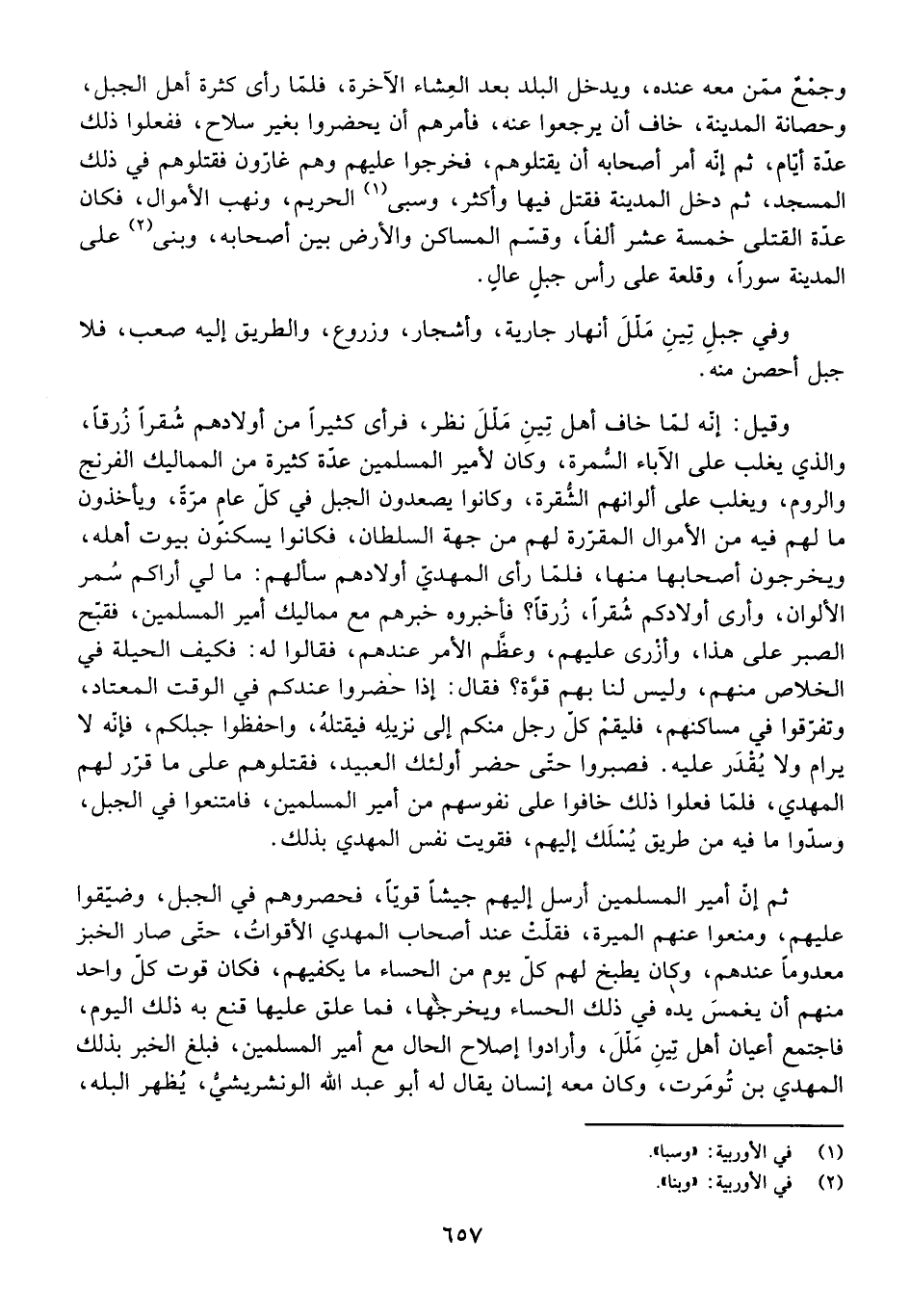 وَقِيلَ: إِنَّهُ لَمَّا خَافَ أَهْلَ تِينِ مَلَّلَ نَظَرَ، فَرَأَى كَثِيرًا مِنْ أَوْلَادِهِمْ شُقْرًا زُرْقًا، وَالَّذِي يَغْلِبُ عَلَى الْآبَاءِ السُّمْرَةُ، وَكَانَ لِأَمِيرِ الْمُسْلِمِينَ عِدَّةٌ كَثِيرَةٌ مِنَ الْمَمَالِيكِ الْفِرِنْجِ وَالرُّومِ، وَيَغْلِبُ عَلَى أَلْوَانِهِمُ الشُّقْرَةُ، وَكَانُوا يَصَعِدُونَ الْجَبَلَ فِي كُلِّ عَامٍ مَرَّةً، وَيَأْخُذُونَ مَا لَهُمْ فِيهِ مِنَ الْأَمْوَالِ الْمُقَرَّرَةِ لَهُمْ مِنْ جِهَةِ السُّلْطَانِ، فَكَانُوا يَسْكُنُونَ بُيُوتَ أَهْلِهِ، وَيُخْرِجُونَ أَصْحَابَهَا مِنْهَا، فَلَمَّا رَأَى الْمَهْدِيُّ أَوْلَادَهُمْ سَأَلَهُمْ: مَا لِي أَرَاكُمْ سُمْرَ الْأَلْوَانِ، وَأَرَى أَوْلَادَكُمْ شُقْرًا، زُرْقًا؟ فَأَخْبَرُوهُ خَبَرَهُمْ مَعَ مَمَالِيكِ أَمِيرِ الْمُسْلِمِينَ، فَقَبَّحَ الصَّبْرَ عَلَى هَذَا، وَأَزْرَى عَلَيْهِمْ، وَعَظَّمَ الْأَمْرَ عِنْدَهُمْ، فَقَالُوا لَهُ: فَكَيْفَ الْحِيلَةُ فِي الْخَلَاصِ مِنْهُمْ، وَلَيْسَ لَنَا بِهِمْ قُوَّةٌ؟ فَقَالَ: إِذَا حَضَرُوا عِنْدَكُمْ فِي الْوَقْتِ الْمُعْتَادِ، وَتَفَرَّقُوا فِي مَسَاكِنِهِمْ، فَلْيَقُمْ كُلُّ رَجُلٍ مِنْكُمْ إِلَى نَزِيلِهِ فَيَقْتُلَهُ، وَاحْفَظُوا جَبَلَكُمْ، فَإِنَّهُ لَا يُرَامُ وَلَا يُقْدَرُ عَلَيْهِ. فَصَبَرُوا حَتَّى حَضَرَ أُولَئِكَ الْعَبِيدُ، فَقَتَلُوهُمْ عَلَى مَا قَرَّرَ لَهُمُ الْمَهْدِيُّ، فَلَمَّا فَعَلُوا ذَلِكَ خَافُوا عَلَى نُفُوسِهِمْ مِنْ أَمِيرِ الْمُسْلِمِينَ، فَامْتَنَعُوا فِي الْجَبَلِ، وَسَدُّوا مَا فِيهِ مِنْ طَرِيقٍ يُسْلَكُ إِلَيْهِمْ، فَقَوِيَتْ نَفْسُ الْمَهْدِيِّ بِذَلِكَ.