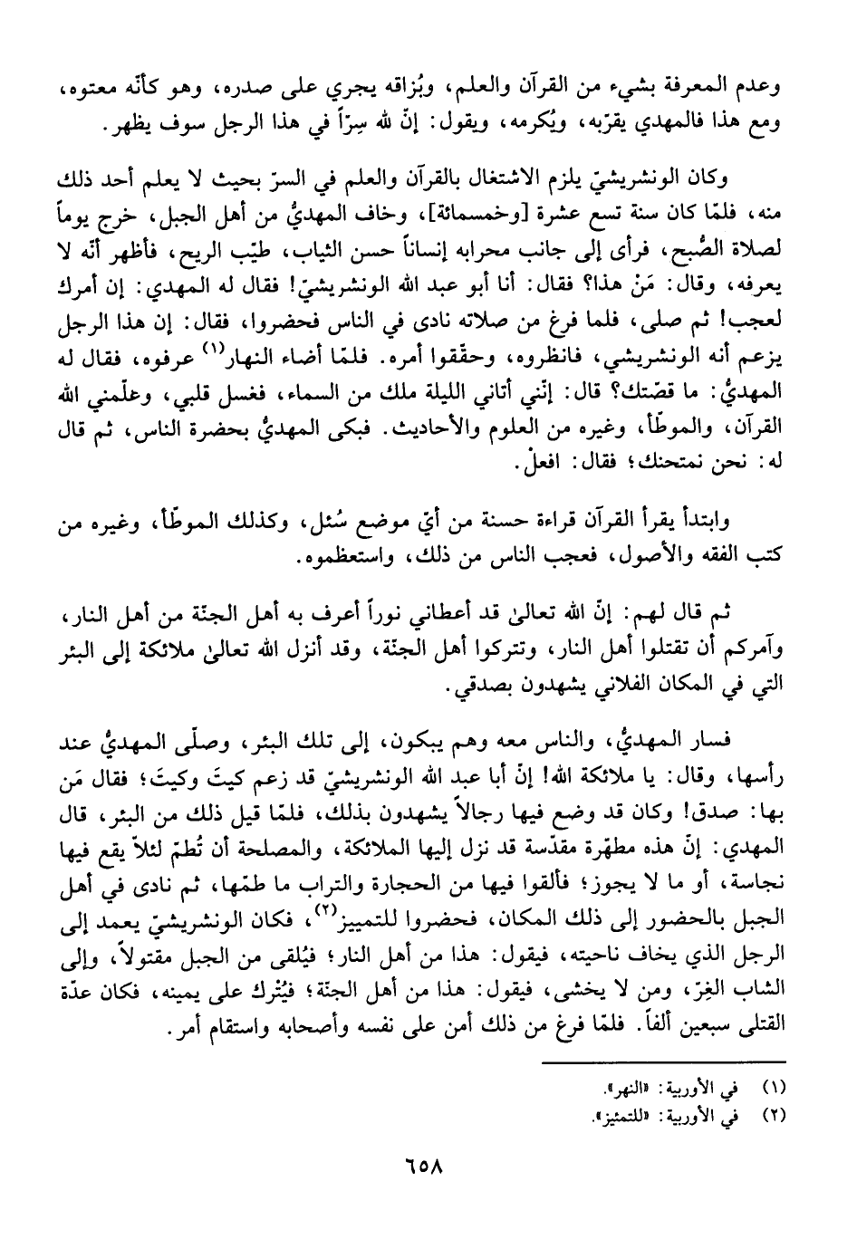فَسَارَ الْمَهْدِيُّ، وَالنَّاسُ مَعَهُ وَهُمْ يَبْكُونَ، إِلَى تِلْكَ الْبِئْرِ، وَصَلَّى الْمَهْدِيُّ عِنْدَ رَأْسِهَا، وَقَالَ: يَا مَلَائِكَةَ اللَّهِ، إِنَّ أَبَا عَبْدِ اللَّهِ الْوَنْشَرِيشِيَّ قَدْ زَعَمَ كَيْتَ وَكَيْتَ، فَقَالَ مَنْ بِهَا: صَدَقَ! وَكَانَ قَدْ وَضَعَ فِيهَا رِجَالًا يَشْهَدُونَ بِذَلِكَ فَلَمَّا قِيلَ ذَلِكَ مِنَ الْبِئْرِ، قَالَ الْمَهْدِيُّ: إِنَّ هَذِهِ مُطَهَّرَةٌ مُقَدَّسَةٌ قَدْ نَزَلَ إِلَيْهَا الْمَلَائِكَةُ، وَالْمَصْلَحَةُ أَنْ تُطَمَّ لِئَلَّا يَقَعَ فِيهَا نَجَاسَةٌ، أَوْ مَا لَا يَجُوزُ، فَأَلْقَوْا فِيهَا مِنَ الْحِجَارَةِ وَالتُّرَابِ مَا طَمَّهَا، ثُمَّ نَادَى فِي أَهْلِ الْجَبَلِ بِالْحُضُورِ إِلَى ذَلِكَ الْمَكَانِ، فَحَضَرُوا لِلتَّمْيِيزِ، فَكَانَ الْوَنْشَرِيشِيُّ يَعْمِدُ إِلَى الرَّجُلِ الَّذِي يَخَافُ نَاحِيَتَهُ، فَيَقُولُ: هَذَا مِنْ أَهْلِ النَّارِ، فَيُلْقَى مِنَ الْجَبَلِ مَقْتُولًا، وَإِلَى الشَّابِّ الْغِرِّ، وَمَنْ لَا يَخْشَى، فَيَقُولُ: هَذَا مِنْ أَهْلِ الْجَنَّةِ، فَيُتْرَكُ عَلَى يَمِينِهِ، فَكَانَ عِدَّةُ الْقَتْلَى سَبْعِينَ أَلْفًا فَلَمَّا فَرَغَ مِنْ ذَلِكَ أَمِنَ عَلَى نَفْسِهِ وَأَصْحَابِهِ وَاسْتَقَامَ أَمْرُهُ.