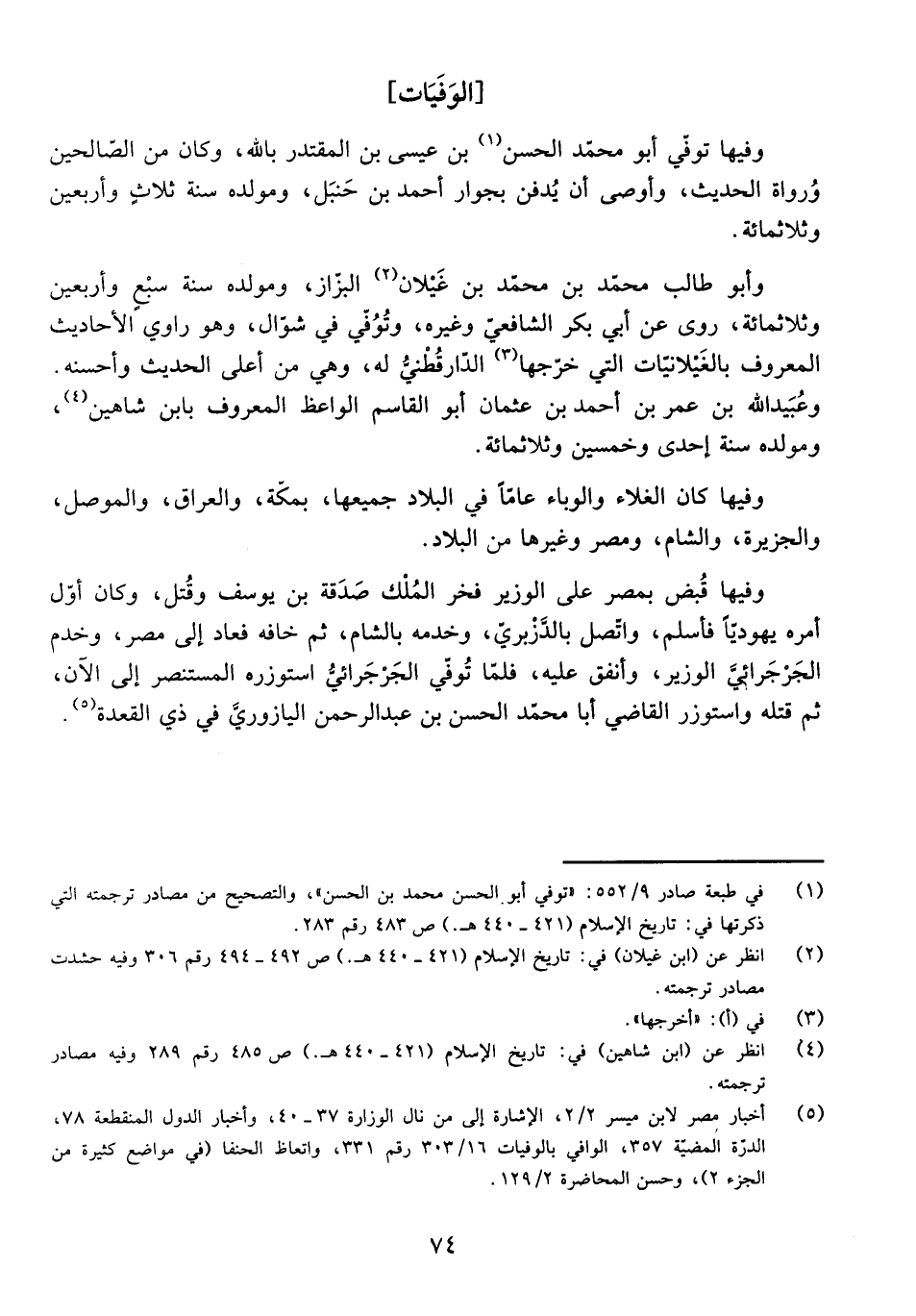 وَأَبُو طَالِبٍ مُحَمَّدُ بْنُ مُحَمَّدِ بْنِ غَيْلَانَ الْبَزَّازُ، وَمَوْلِدُهُ سَنَةَ سَبْعٍ وَأَرْبَعِينَ وَثَلَاثِمِائَةٍ، رَوَى عَنْ أَبِي بَكْرٍ الشَّافِعِيِّ وَغَيْرِهِ، وَتُوُفِّيَ فِي شَوَّالٍ، وَهُوَ رَاوِي الْأَحَادِيثِ الْمَعْرُوفَةِ بِالْغَيْلَانِيَّاتِ الَّتِي خَرَّجَهَا الدَّارَقُطْنِيُّ لَهُ، وَهِيَ مِنْ أَعْلَى الْحَدِيثِ وَأَحْسَنِهِ. وَعُبَيْدُ اللَّهِ بْنُ عُمَرَ بْنِ أَحْمَدَ بْنِ عُثْمَانَ أَبُو الْقَاسِمِ الْوَاعِظُ، الْمَعْرُوفُ بِابْنِ شَاهِينَ، وَمَوْلِدُهُ سَنَةَ إِحْدَى وَخَمْسِينَ وَثَلَاثِمِائَة ٍ.