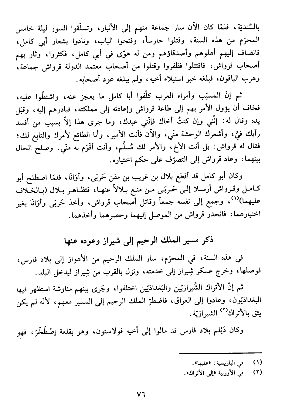 ثُمَّ إِنَّ الْأَتْرَاكَ الشِّيرَازِيِّينَ وَالْبَغْدَاذِيِّينَ اخْتَلَفُوا، وَجَرَى بَيْنَهُمْ مُنَاوَشَةٌ اسْتَظْهَرَ فِيهَا الْبَغْدَاذِيُّونَ، وَعَادُوا إِلَى الْعِرَاقِ، فَاضْطَرَّ الْمَلِكُ الرَّحِيمُ إِلَى الْمَسِيرِ مَعَهُمْ ; لِأَنَّهُ لَمْ يَكُنْ يَثِقُ بِالْأَتْرَاكِ الشِّيرَازِيَّة ِ.