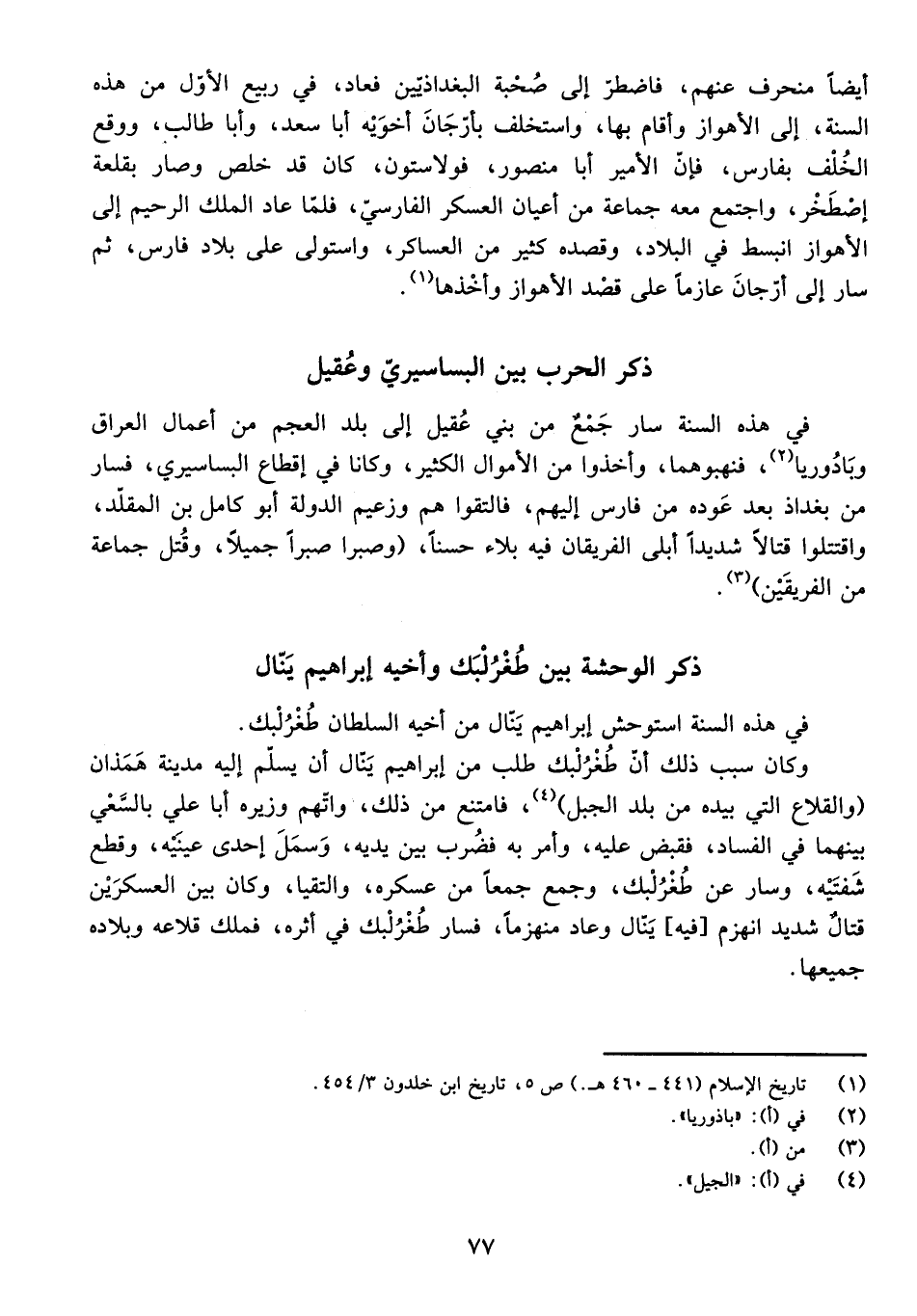 فِي هَذِهِ السَّنَةِ سَارَ جَمْعٌ مِنْ بَنِي عُقَيْلٍ إِلَى بَلَدِ الْعَجَمِ مِنْ أَعْمَالِ الْعِرَاقِ وَبَادُورْيَا، فَنَهَبُوهُمَا وَأَخَذُوا مِنَ الْأَمْوَالِ الْكَثِيرَ، وَكَانَا فِي إِقْطَاعِ الْبَسَاسِيرِيِّ، فَسَارَ مِنْ بَغْدَاذَ بَعْدَ عَوْدِهِ مِنْ فَارِسَ إِلَيْهِمْ، فَالْتَقَوْا هُمْ وَزَعِيمُ الدَّوْلَةِ أَبُو كَامِلِ بْنُ الْمُقَلِّدِ، وَاقْتَتَلُوا قِتَالًا شَدِيدًا أَبْلَى الْفَرِيقَانِ فِيهِ بَلَاءً حَسَنًا، (وَصَبَرَا صَبْرًا جَمِيلًا، وَقُتِلَ جَمَاعَةٌ مِنَ الْفَرِيقَيْنِ) .