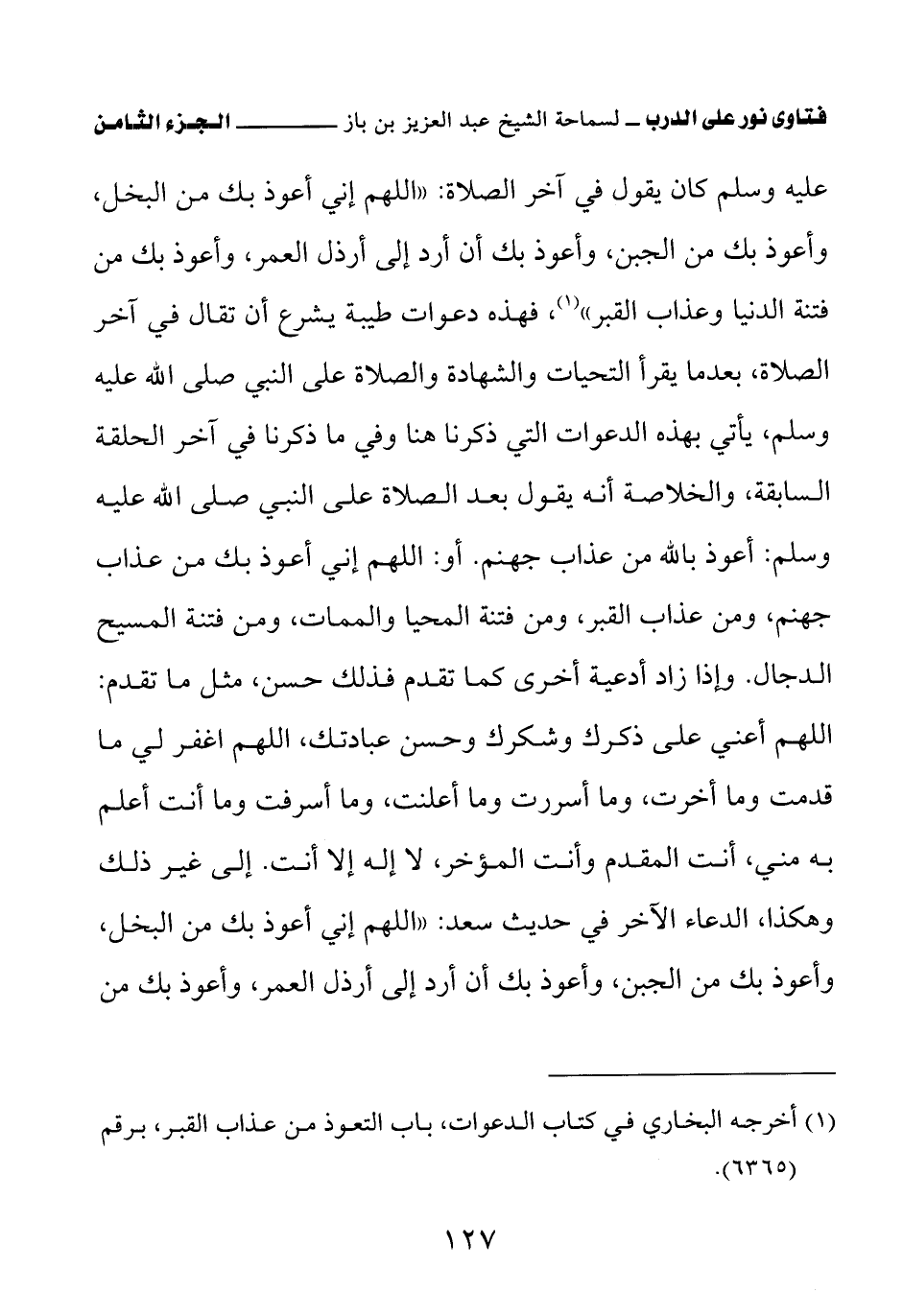 والخلاصة أنه يقول بعد الصلاة على النبي صلى الله عليه وسلم: أعوذ بالله من عذاب جهنم، أو اللهم إني أعوذ بك من عذاب جهنم، ومن عذاب القبر، ومن فتنة المحيا والممات، ومن فتنة المسيح الدجال. وإذا زاد أدعية أخرى كما تقدم فذلك حسن، مثل ما تقدم: اللهم أعني على ذكرك وشكرك وحسن عبادتك، اللهم اغفر لي ما قدمت وما أخرت، وما أسررت وما أعلنت، وما أسرفت وما أنت أعلم به مني، أنت المقدم وأنت المؤخر، لا إله إلا أنت. إلى غير ذلك وهكذا، الدعاء الآخر في حديث سعد: «اللهم إني أعوذ بك من البخل، وأعوذ بك من الجبن، وأعوذ بك أن أرد إلى أرذل العمر، وأعوذ بك من