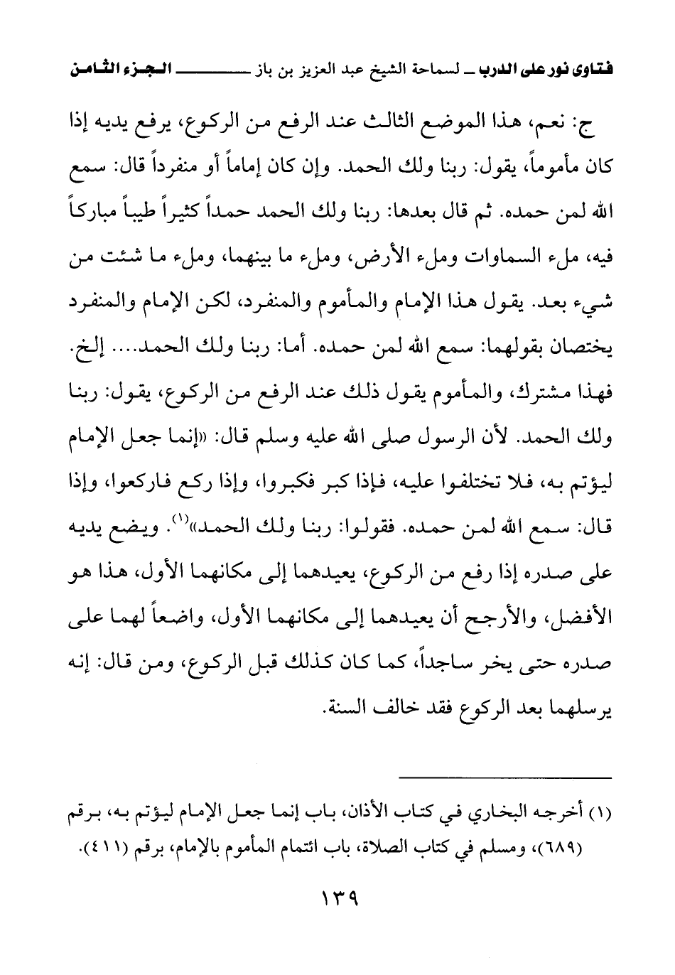 ج: نعم، هذا الموضع الثالث عند الرفع من الركوع، يرفع يديه إذا كان مأموما، يقول: ربنا ولك الحمد. وإن كان إماما أو منفردا قال: سمع الله لمن حمده. ثم قال بعدها: ربنا ولك الحمد حمدا كثيرا طيبا مباركا فيه ملء السماوات وملء الأرض، وملء ما بينهما، وملء ما شئت من شيء بعد. يقول هذا الإمام والمأموم والمنفرد، لكن الإمام والمنفرد يختصان بقولهما: سمع الله لمن حمده. أما: ربنا ولك الحمد. . . . . . . الخ. فهذا مشترك، والمأموم يقول ذلك عند الرفع من الركوع، يقول: ربنا ولك الحمد. لأن الرسول صلى الله عليه وسلم قال: «إنما جعل الإمام ليؤتم به، فلا تختلفوا عليه، فإذا كبر فكبروا، وإذا ركع فاركعوا، وإذا قال: سمع الله لمن حمده. فقولوا: ربنا ولك الحمد (¬1)»