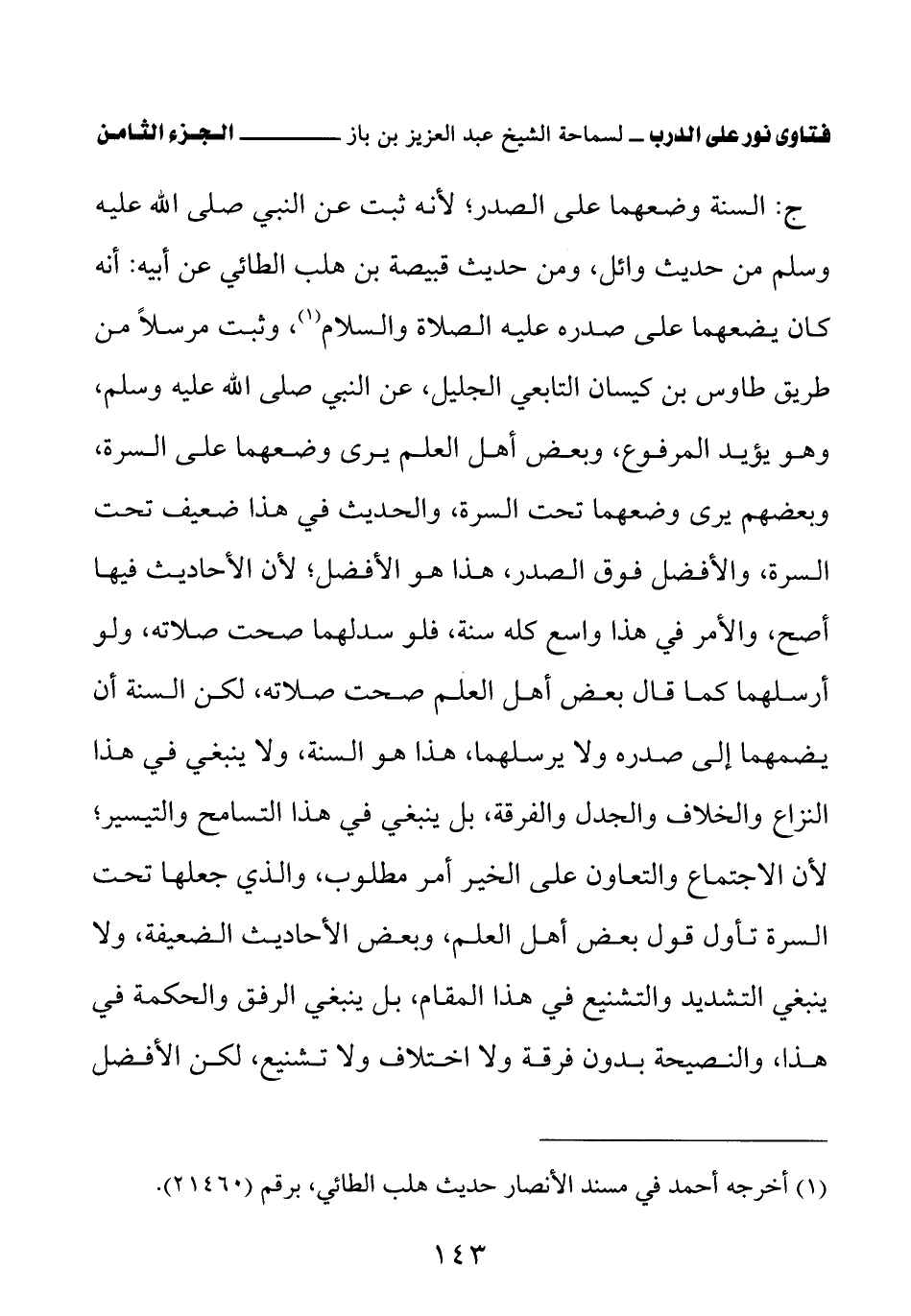 هذا هو الأفضل؛ لأن الأحاديث فيها أصح، والأمر في هذا واسع كله سنة، فلو سدلهما صحت صلاته، ولو أرسلهما كما قال بعض أهل العلم صحت صلاته، لكن السنة أن يضمهما إلى صدره ولا يرسلهما، هذا هو السنة، ولا ينبغي في هذا النزاع والخلاف والجدل والفرقة، بل ينبغي في هذا التسامح والتيسير؛ لأن الاجتماع والتعاون على الخير أمر مطلوب، والذي جعلها تحت السرة تأول قول بعض أهل العلم، وبعض الأحاديث الضعيفة، ولا ينبغي التشديد والتشنيع في هذا المقام، بل ينبغي الرفق والحكمة في هذا، والنصيحة بدون فرقة ولا اختلاف ولا تشنيع، لكن الأفضل