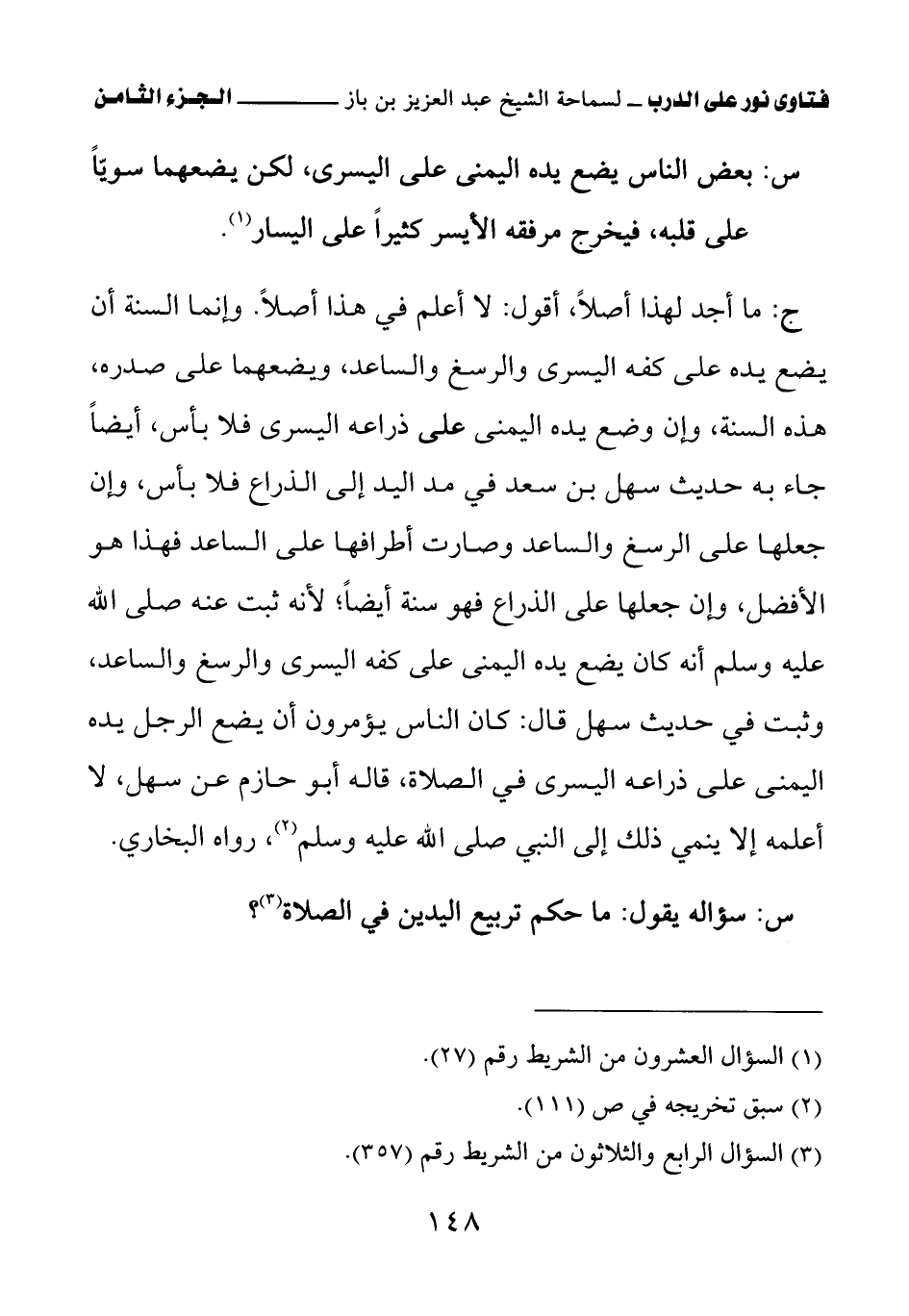 س: بعض الناس يضع يده اليمنى على اليسرى، لكن يضعهما سويا على قلبه، فيخرج مرفقه الأيسر كثيرا على اليسار (¬1)