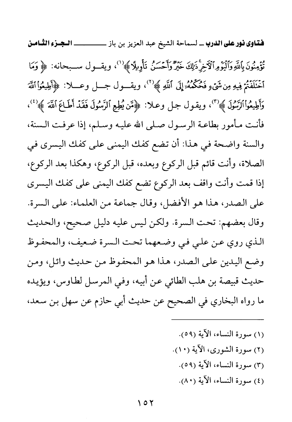 فأنت مأمور بطاعة الرسول صلى الله عليه وسلم، إذا عرفت السنة، والسنة واضحة في هذا: أن تضع كفك اليمنى على كفك اليسرى في الصلاة، وأنت قائم قبل الركوع وبعده، قبل الركوع، وهكذا بعد الركوع، إذا قمت وأنت واقف بعد الركوع تضع كفك اليمنى على كفك اليسرى على الصدر، هذا هو الأفضل، وقال جماعة من العلماء: على السرة. وقال بعضهم: تحت السرة. ولكن ليس عليه دليل صحيح، والحديث الذي روي عن علي في وضعهما تحت السرة ضعيف، والمحفوظ وضع اليدين على الصدر، هذا هو المحفوظ من حديث وائل، ومن حديث قبيصة بن هلب الطائي عن أبيه، وفي المرسل لطاوس، ويؤيده ما رواه البخاري في الصحيح عن حديث أبي حازم عن سهل بن سعد