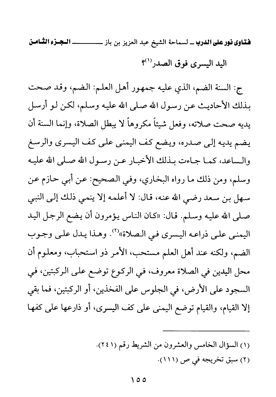 (¬2) أخرجه البخاري في كتاب الأذان، باب وضع اليمنى على اليسرى في الصلاة، برقم (740)