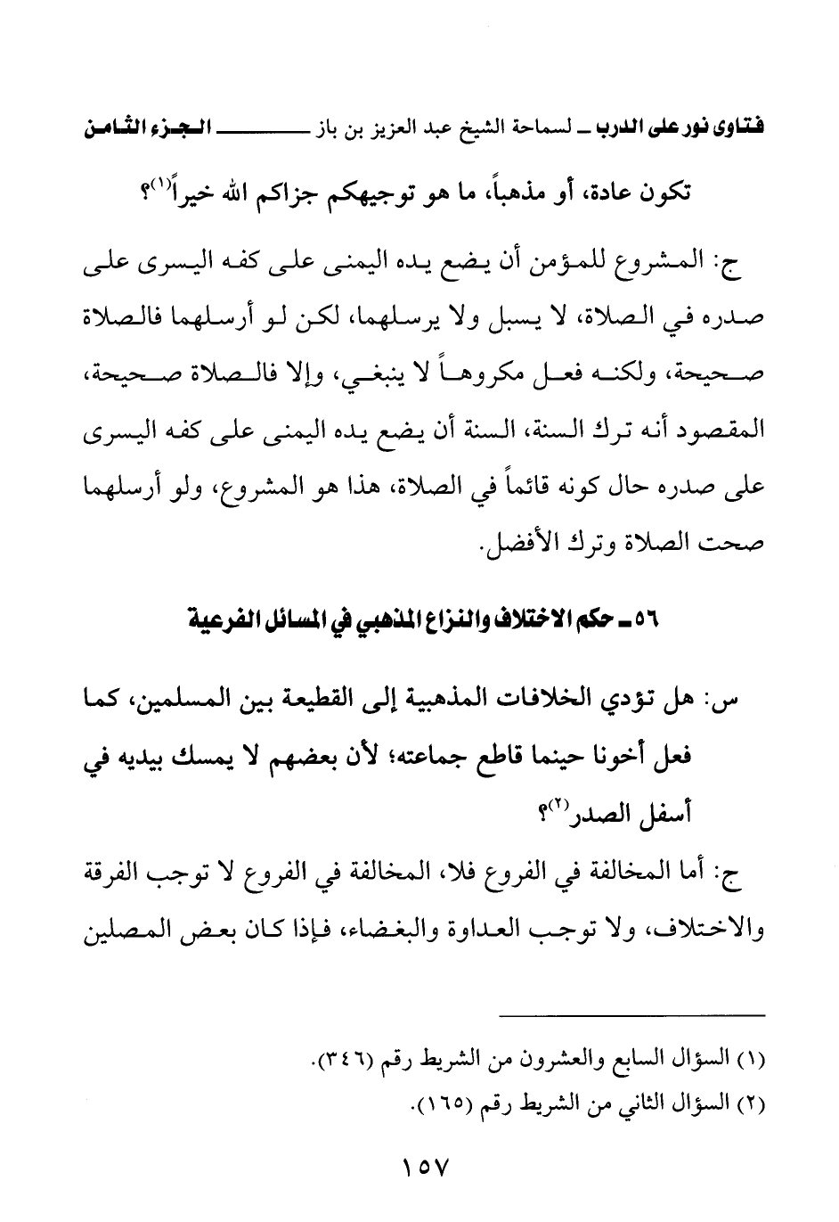 س: هل تؤدي الخلافات المذهبية إلى القطيعة بين المسلمين، كما فعل أخونا حينما قاطع جماعته؛ لأن بعضهم لا يمسك بيديه في أسفل الصدر؟ (¬1)