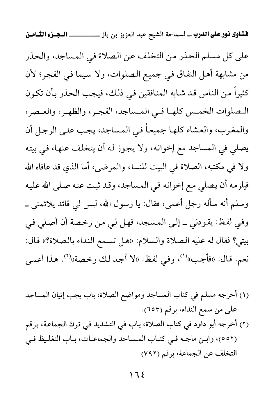 وقد ثبت عنه صلى الله عليه وسلم أنه سأله رجل أعمى، فقال: «يا رسول الله، ليس لي قائد يلائمني – وفي لفظ: يقودني – إلى المسجد، فهل لي من رخصة أن أصلي في بيتي؟ فقال له عليه الصلاة والسلام: (هل تسمع النداء بالصلاة؟) قال: نعم قال: فأجب (¬1)» وفي لفظ: «لا أجد لك رخصة (¬2)»