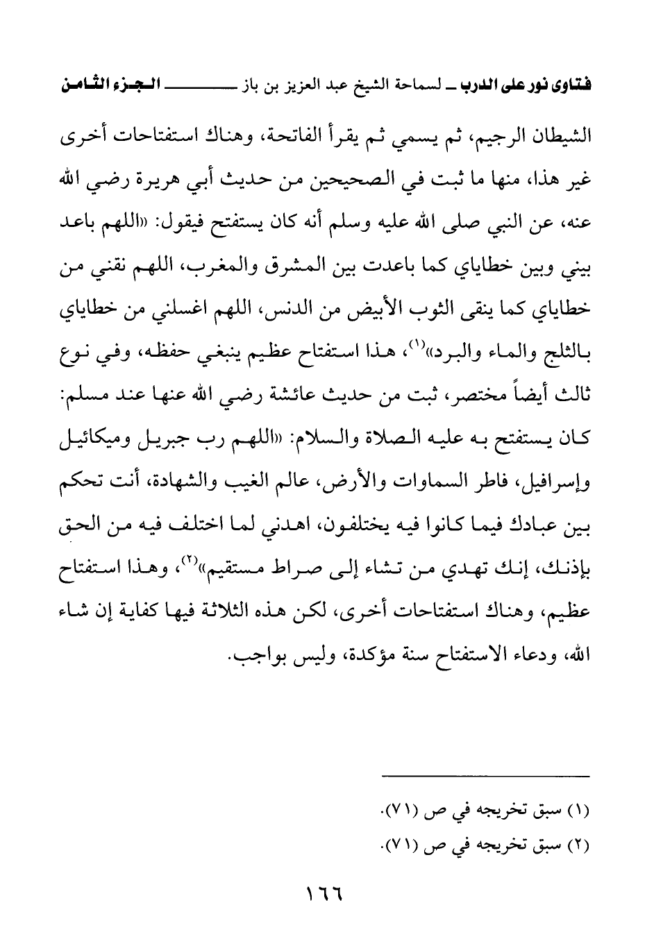 هذا الاستفتاح عظيم ينبغي حفظه، وفي نوع ثالث أيضا مختصر، ثبت من حديث عائشة رضي الله عنها عند مسلم: كان يستفتح به عليه الصلاة والسلام: «اللهم رب جبريل وميكائيل وإسرافيل، فاطر السماوات والأرض عالم الغيب والشهادة، أنت تحكم بين عبادك فيما كانوا فيه يختلفون، اهدني لما اختلف فيه من الحق بإذنك، إنك تهدي من تشاء إلى صراط مستقيم (¬2)» وهذا استفتاح عظيم، وهناك استفتاحات أخرى، لكن هذه الثلاثة فيها كفاية إن شاء الله، ودعاء الاستفتاح سنة مؤكدة، وليس بواجب